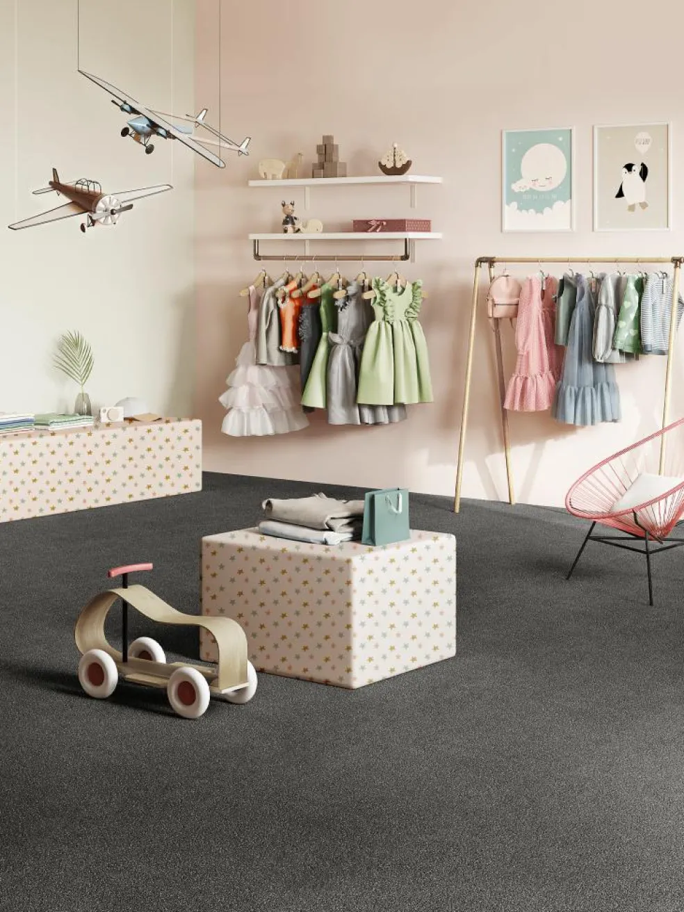 Dieser strapazierfähige Velours-Teppichboden mit dichtem, kurzem Flor vereint Komfort und Langelebigkeit. Die fleckenunempfindliche Oberfläche und das dezente Muster machen ihn ideal für Büro, Homeoffice oder Wohnbereiche. Fußbodenheizung geeignet.