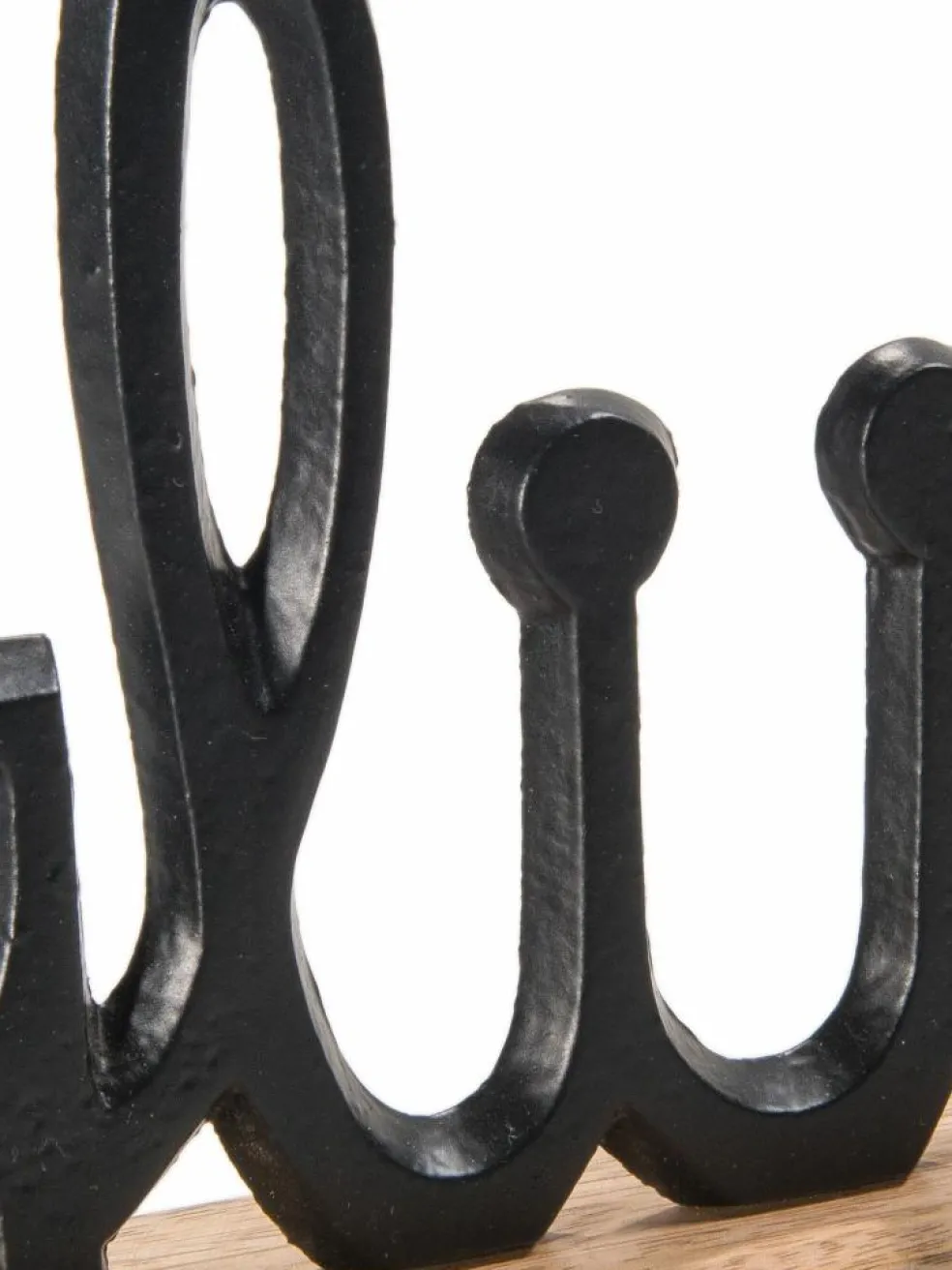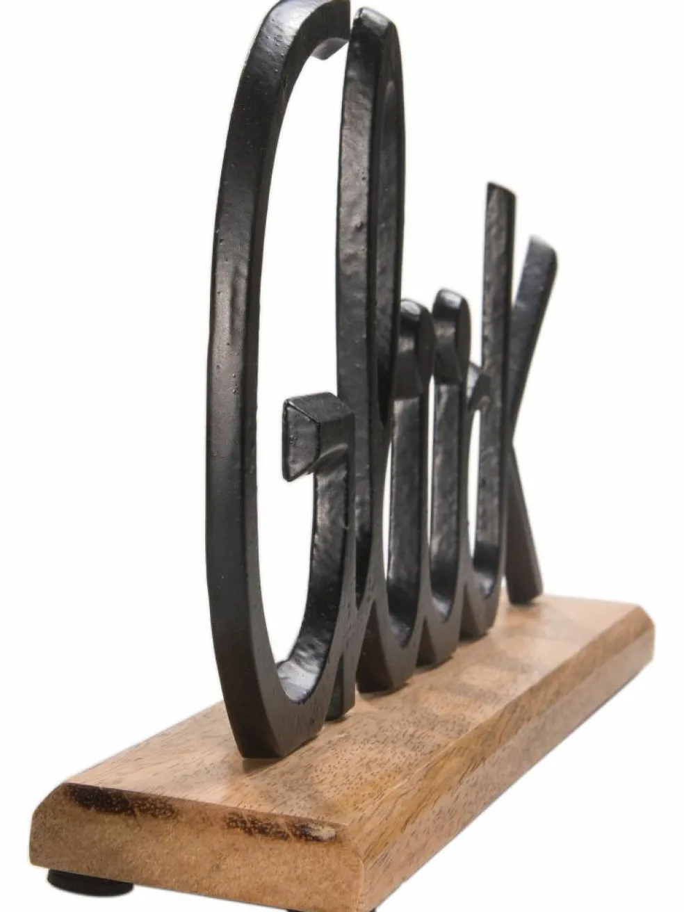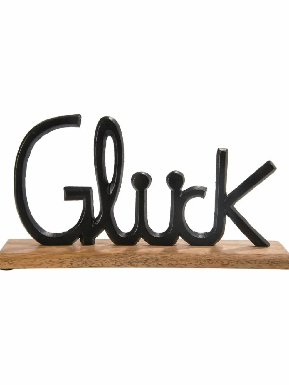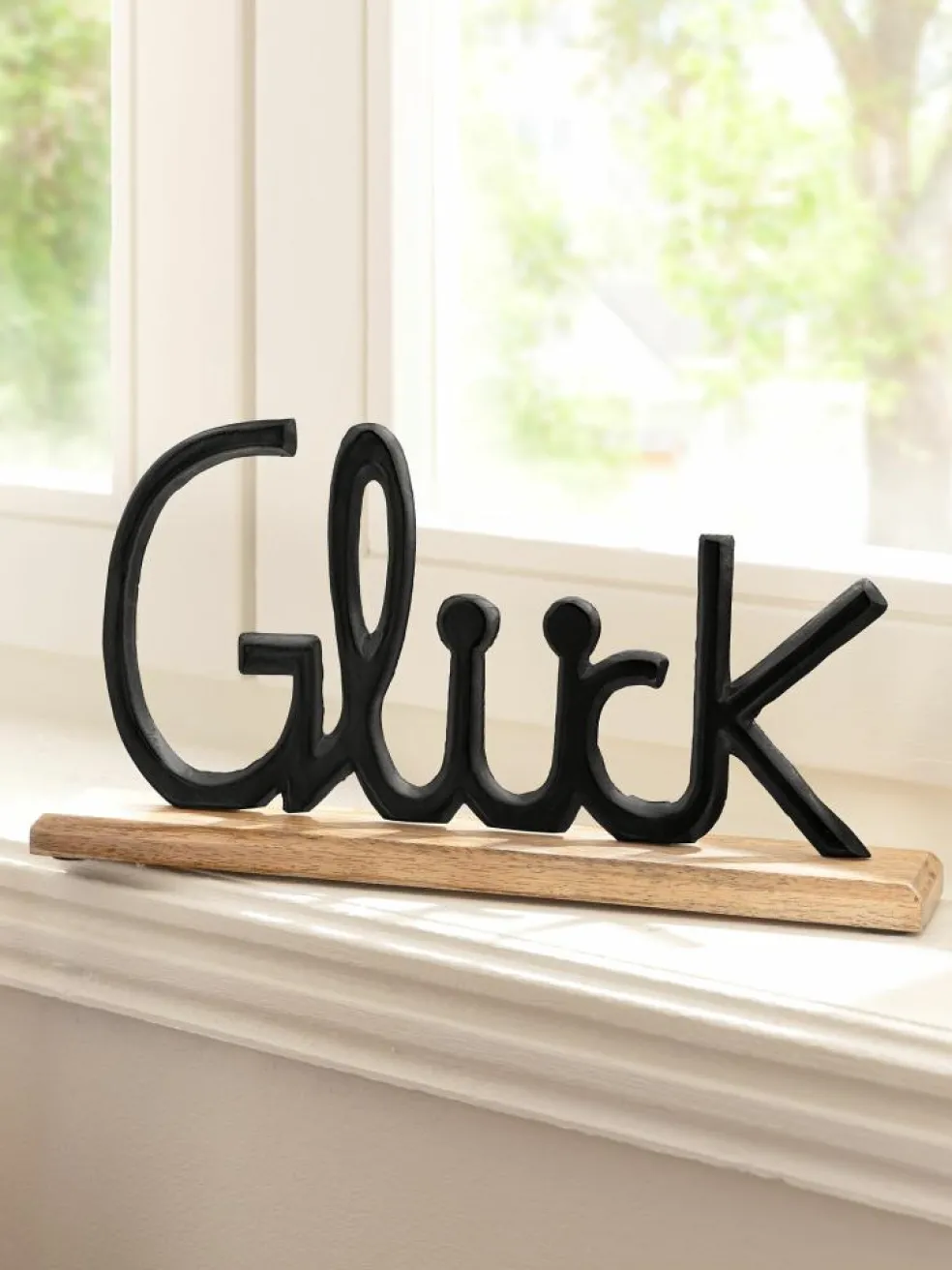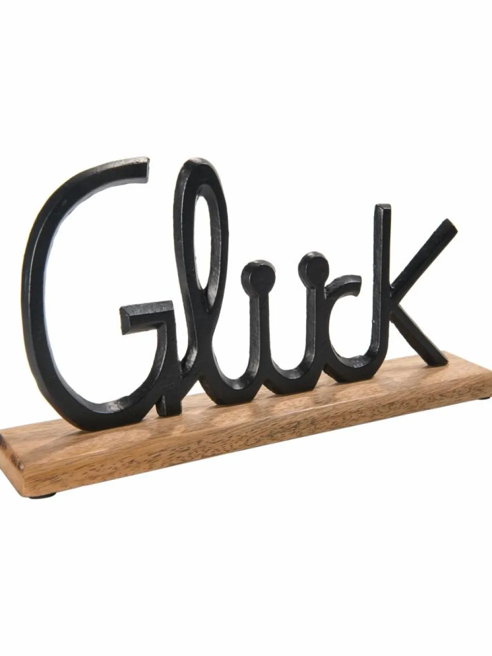 So zieht das Glück zuhause ein! Der schlichte, aus Aluminium gefertigte Schriftzug steht auf hochwertigem Mangoholz und wurde pulverbeschichtet.