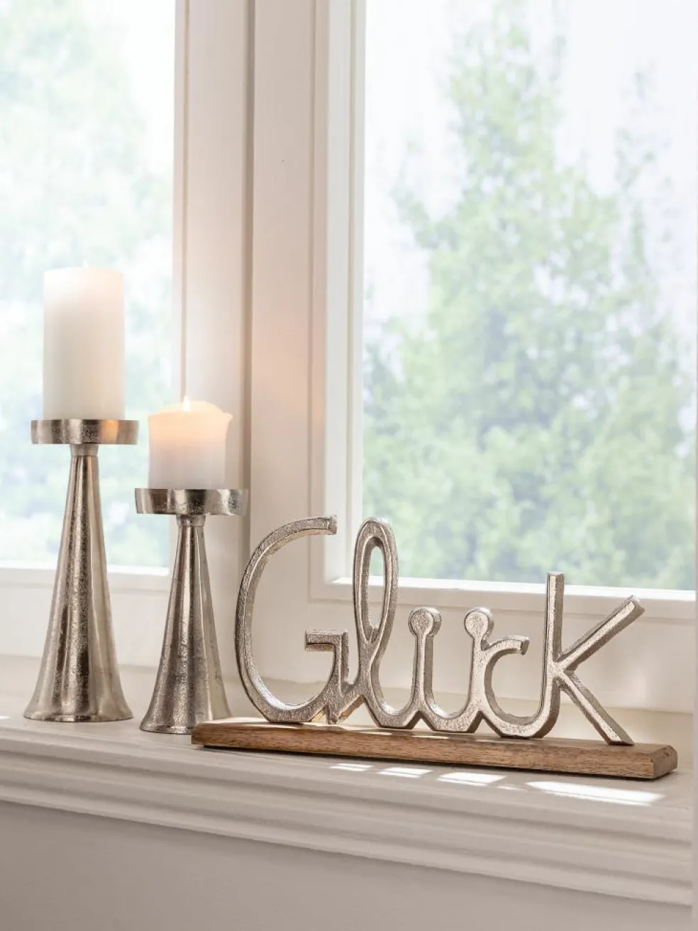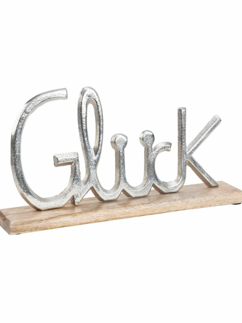 So zieht das Glück zuhause ein! Der schlichte, aus Aluminium gefertigte Schriftzug steht auf hochwertigem Mangoholz und wurde pulverbeschichtet.