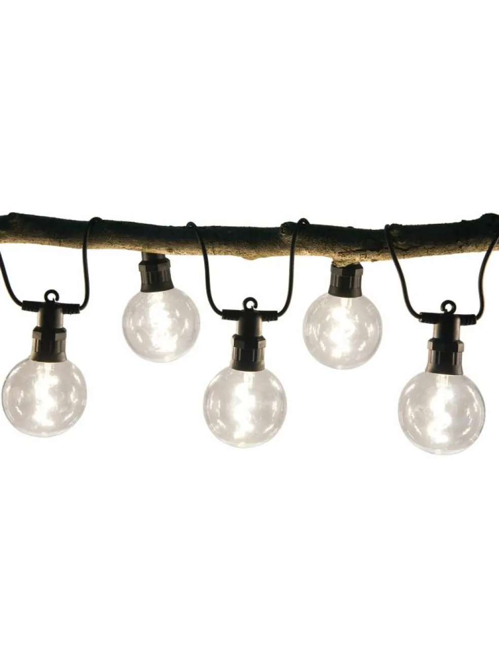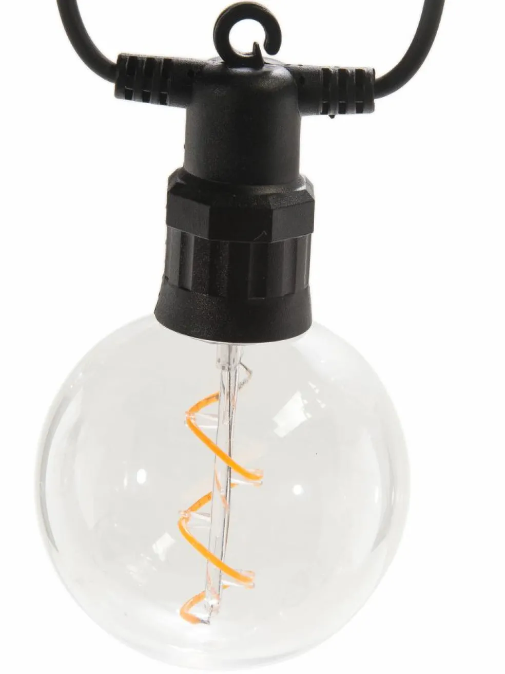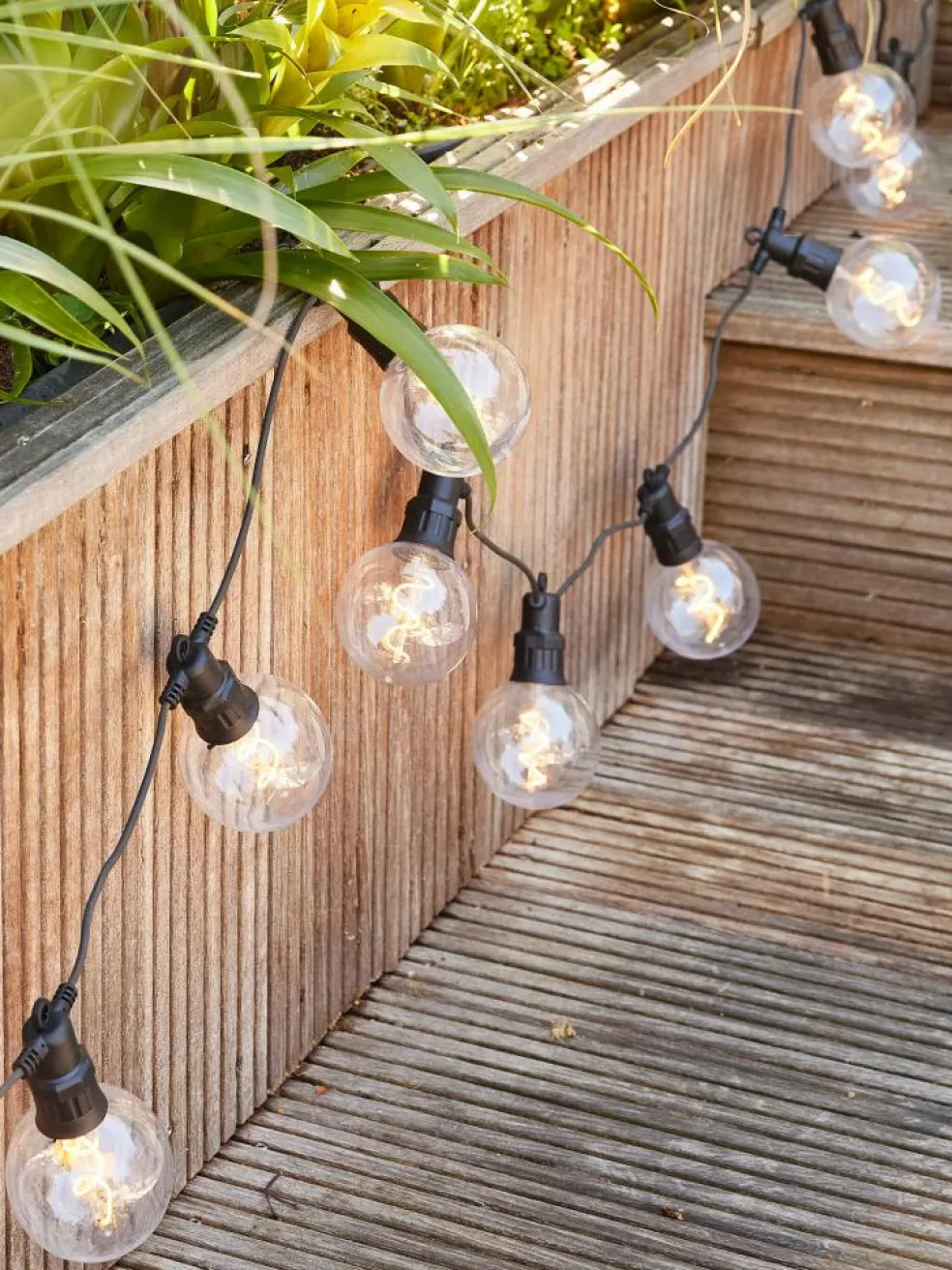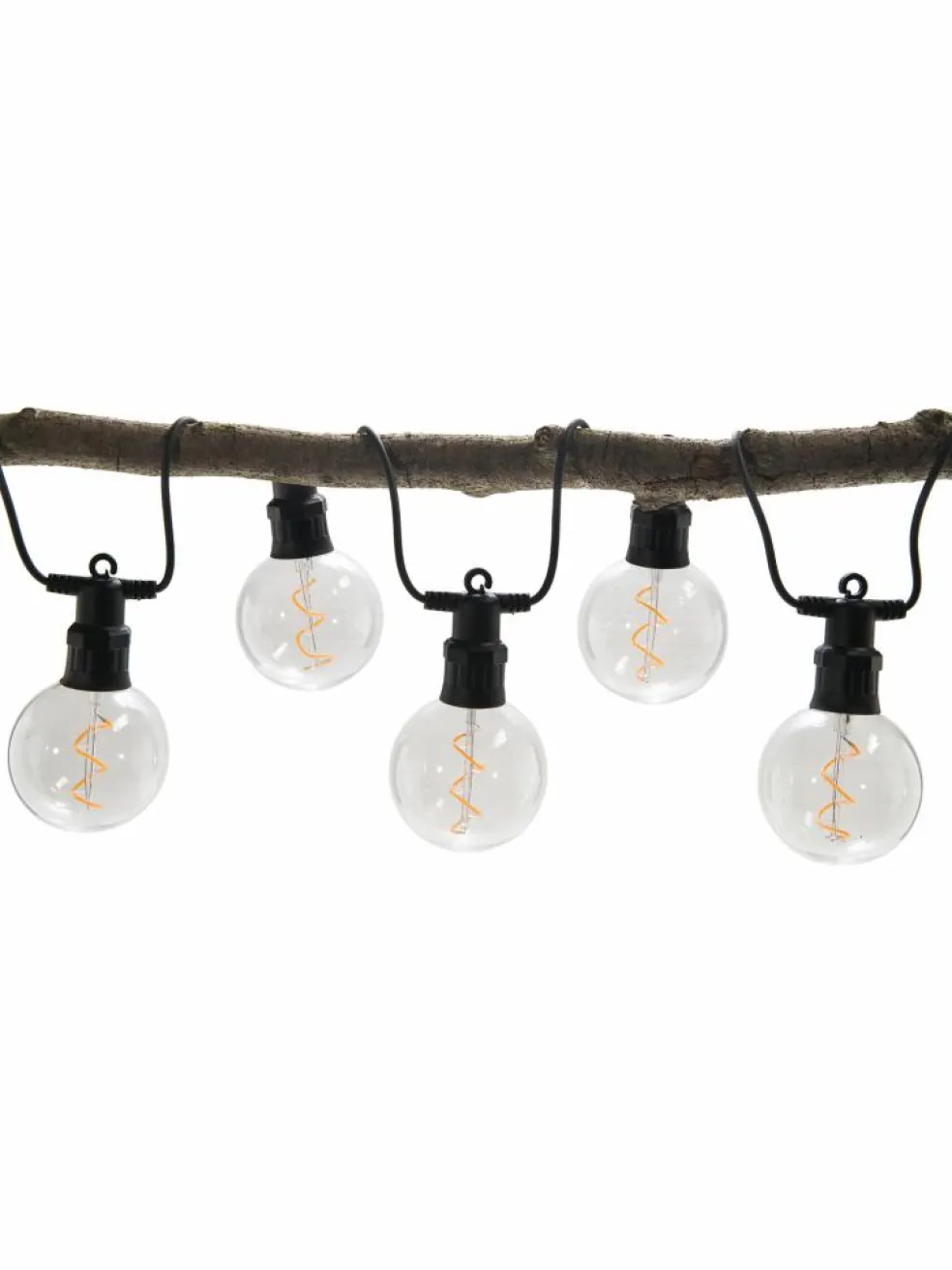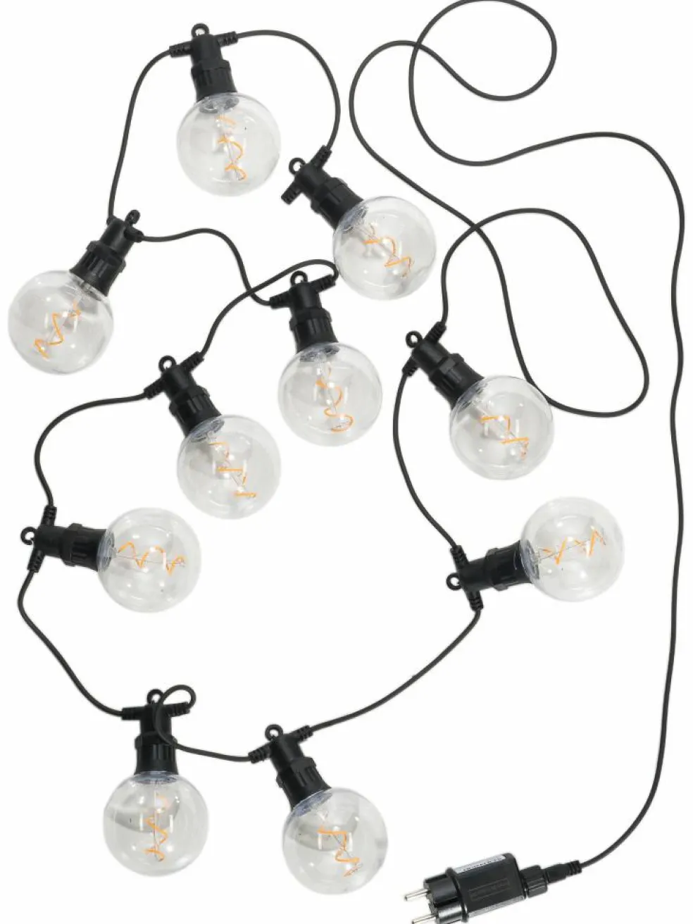 Outdoor-Lichterkette mit zehn Glühbirnen. Was bei lauen Sommerabenden auf Terrasse oder Balkon nicht fehlen darf: Die passende Beleuchtung. Unsere Hogild ist dafür der perfekte Begleiter. Die großen LED-Glühbirnen mit sichtbarem Leuchtdraht sorgen für ein angenehmes warm-weißes Licht. Abstand zwischen einzelnen Birnen ca. 20 cm. Stecker mit Ein- und Ausschalter. Timerfunktion. Spritzwassergeschützt (IP44).