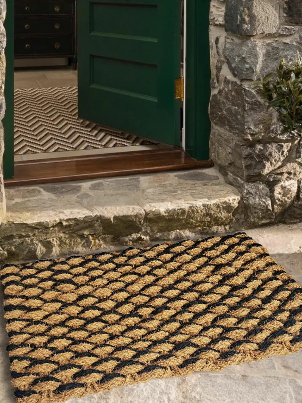 Unsere Kokos-Fußmatte Imati ist mit einer Gesamthöhe von ca. 35 mm besonders stark. Die naturfarbenen und schwarzen Kokosfasern wurden zu einer besonders groben Struktur verflochten, wodurch eine schöne, rustikale Optik entsteht. Für den überdachten Außenbereich und den Zwischenbereich geeignet.