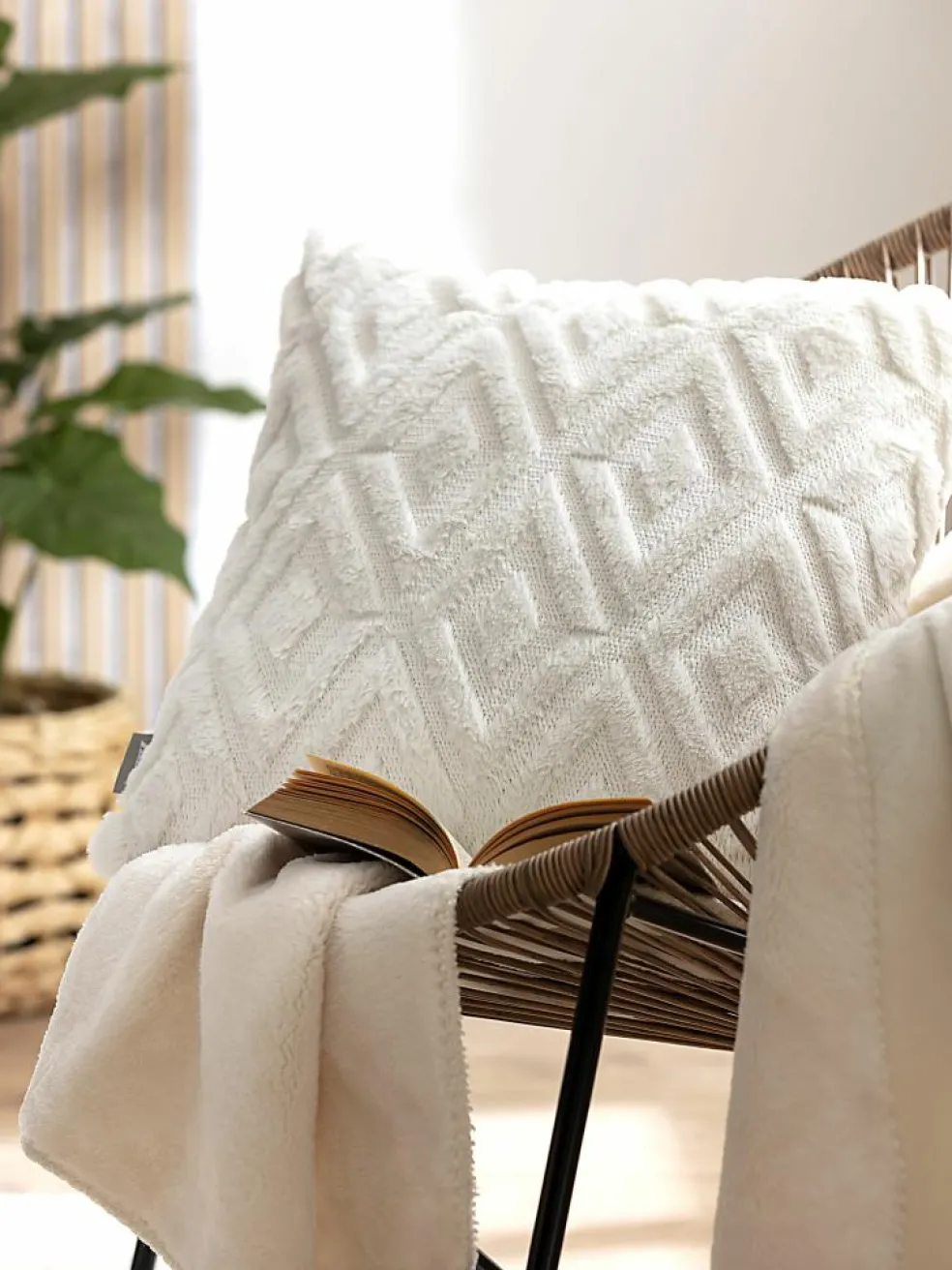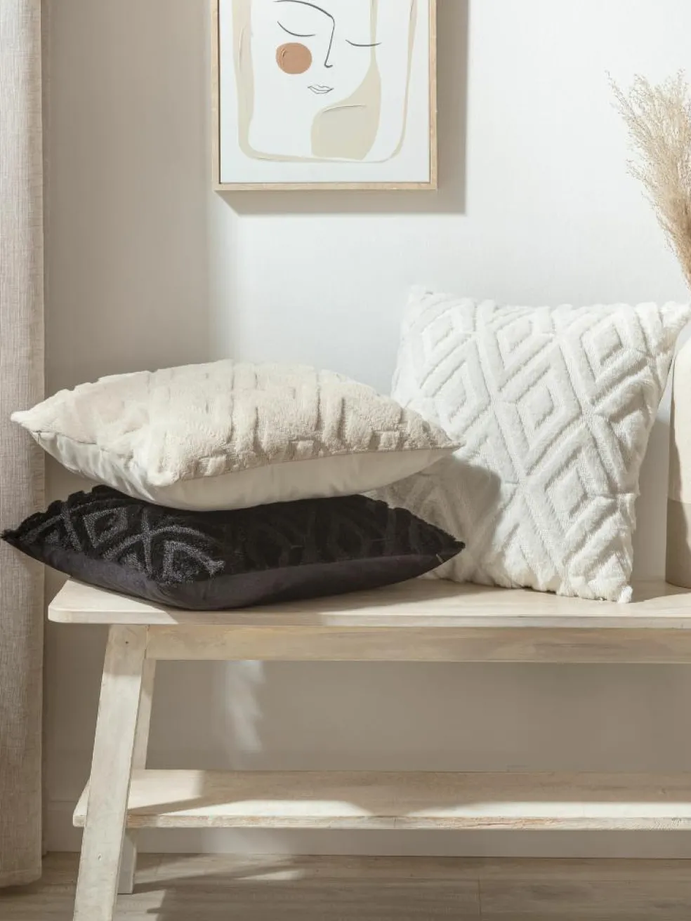Kuschelig weiche Hoch-Tief-Struktur auf der Vorderseite und unifarbene Rückseite. Mit Füllung und Reißverschluss. 100 % Polyester. Oeko-Tex Standard 100.