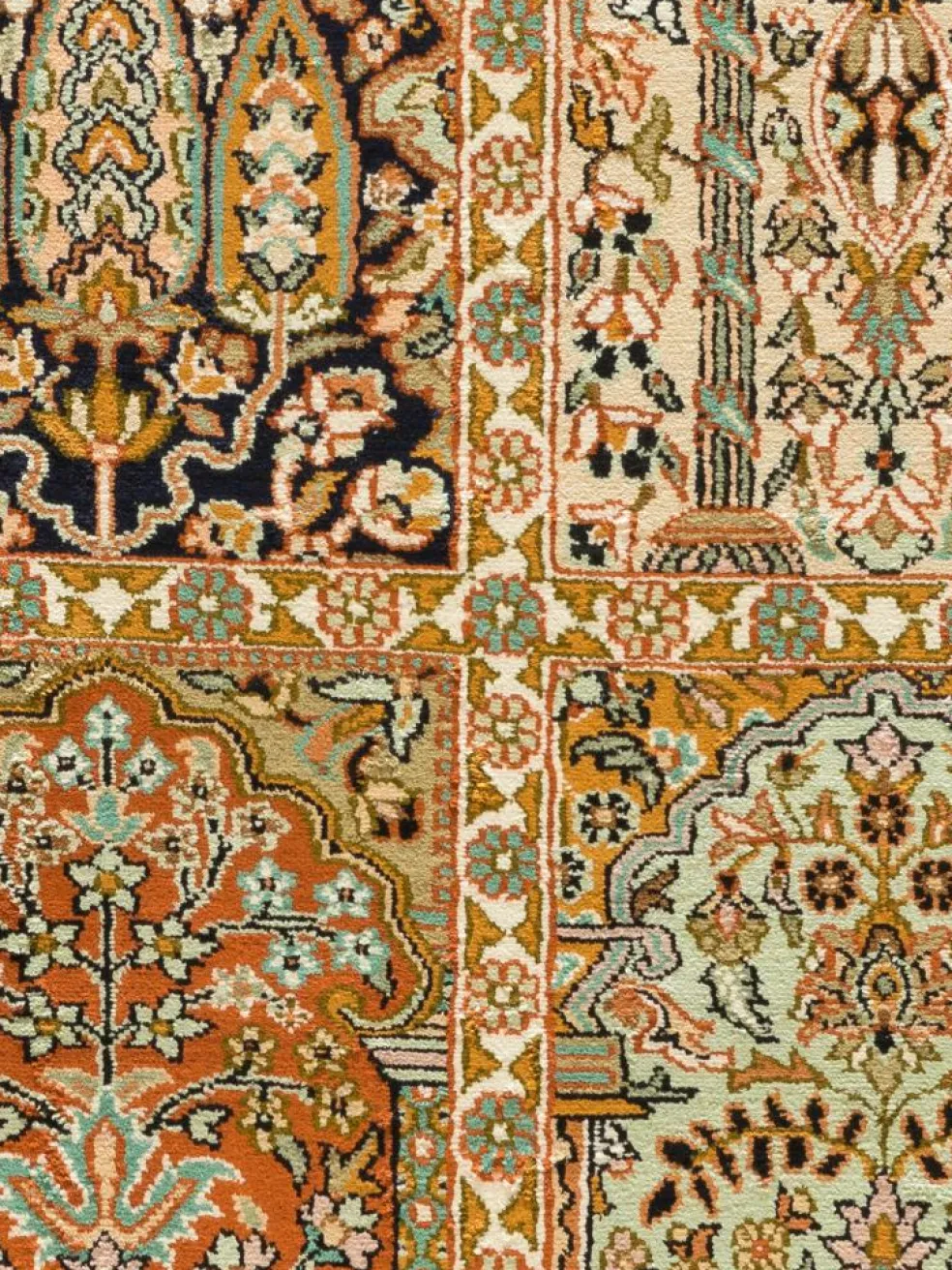 -Teppiche sind eher zurückhaltend, die Muster nach wie vor sehr stark persisch beeinflusst. Florale Motive und das persischeFeldermuster