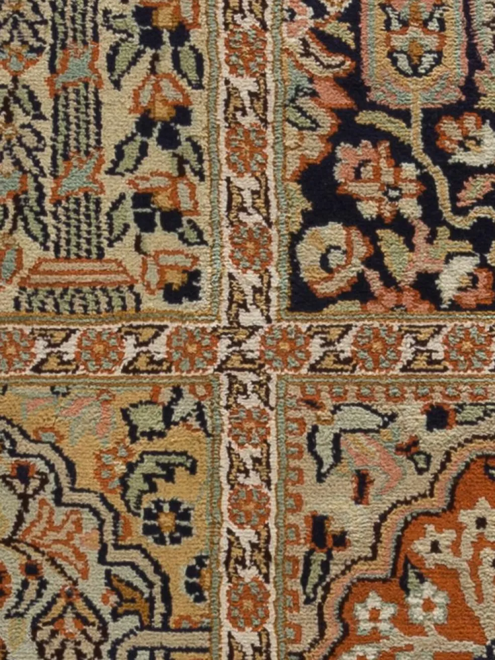 -Teppiche sind eher zurückhaltend, die Muster nach wie vor sehr stark persisch beeinflusst. Florale Motive und das persischeFeldermuster