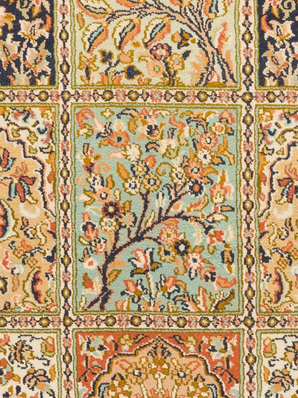 -Teppiche sind eher zurückhaltend, die Muster nach wie vor sehr stark persisch beeinflusst. Florale Motive und das persischeFeldermuster