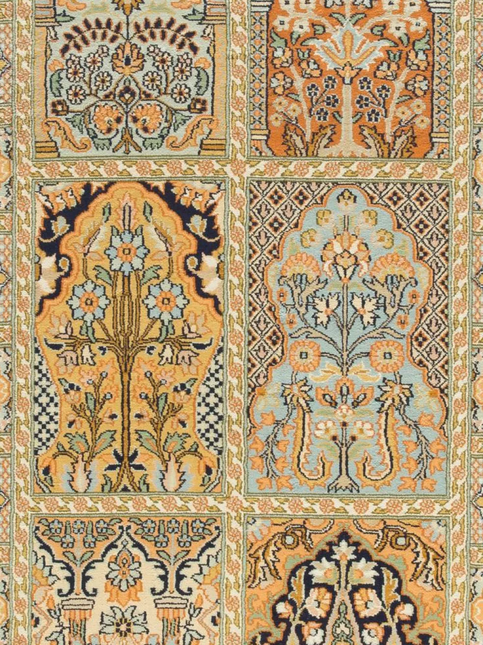 -Teppiche sind eher zurückhaltend, die Muster nach wie vor sehr stark persisch beeinflusst. Florale Motive und das persischeFeldermuster