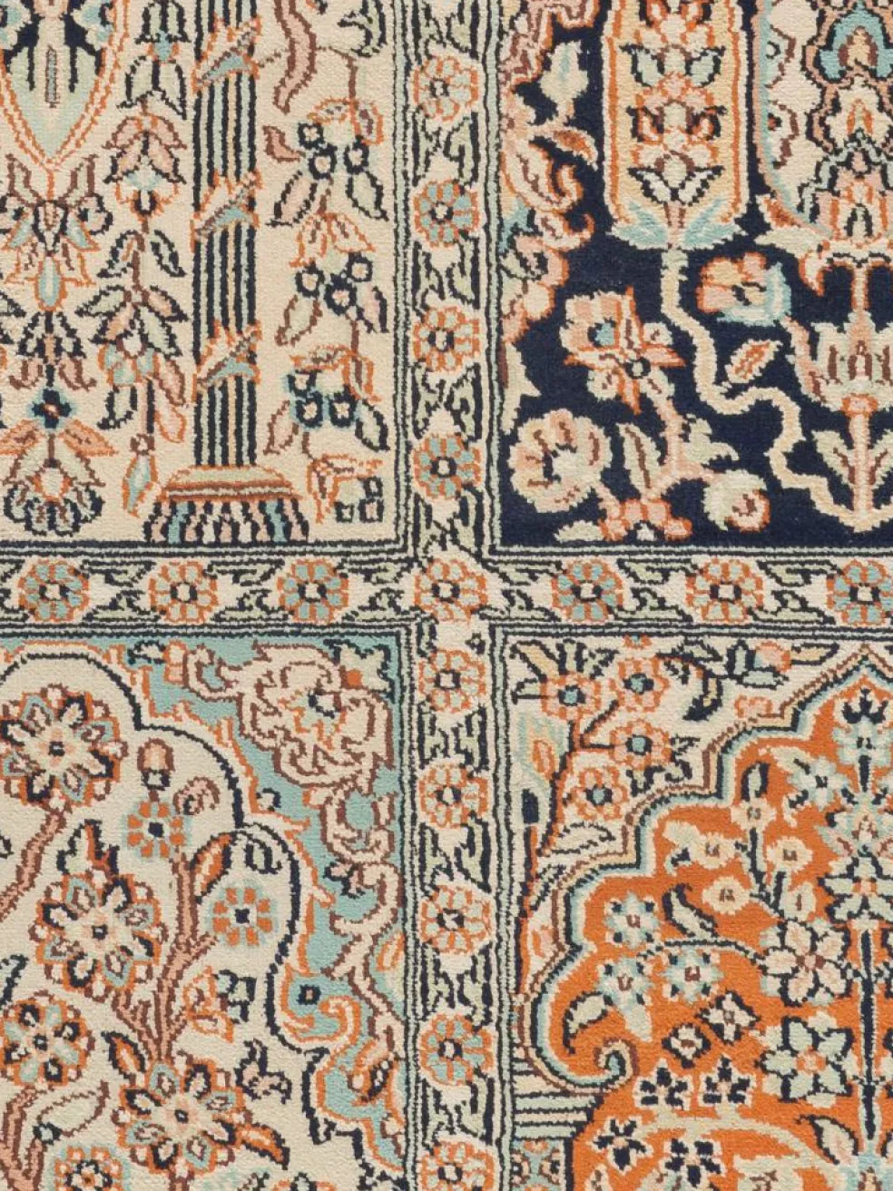 -Teppiche sind eher zurückhaltend, die Muster nach wie vor sehr stark persisch beeinflusst. Florale Motive und das persischeFeldermuster