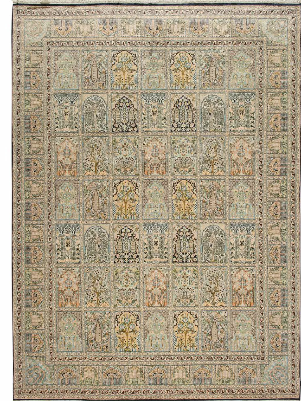 -Teppiche sind eher zurückhaltend, die Muster nach wie vor sehr stark persisch beeinflusst. Florale Motive und das persischeFeldermuster