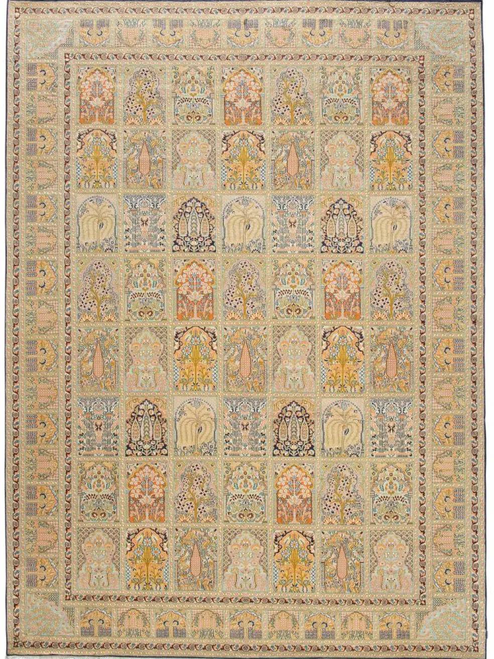 -Teppiche sind eher zurückhaltend, die Muster nach wie vor sehr stark persisch beeinflusst. Florale Motive und das persischeFeldermuster
