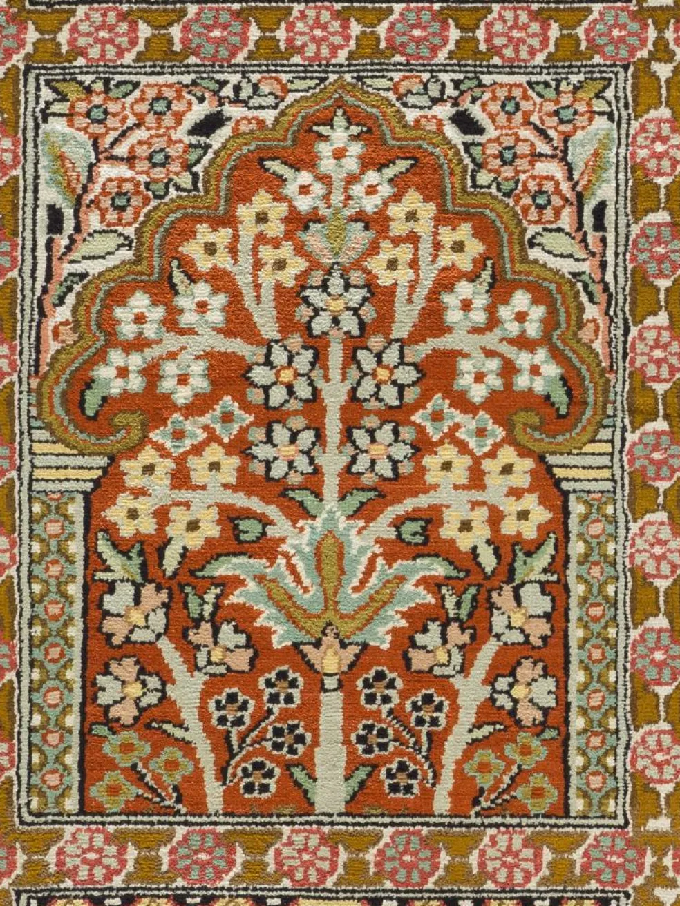 -Teppiche sind eher zurückhaltend, die Muster nach wie vor sehr stark persisch beeinflusst. Florale Motive und das persischeFeldermuster