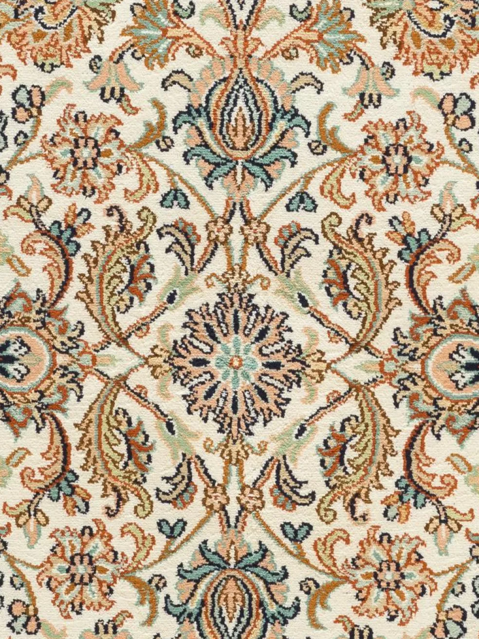 -Teppiche sind eher zurückhaltend, die Muster nach wie vor sehr stark persisch beeinflusst. Florale Motive und das persischeFeldermuster