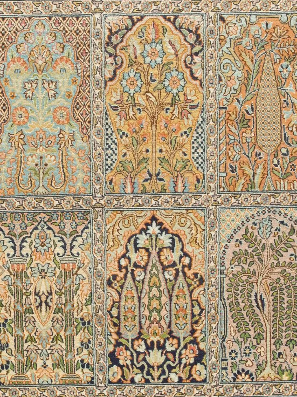 -Teppiche sind eher zurückhaltend, die Muster nach wie vor sehr stark persisch beeinflusst. Florale Motive und das persischeFeldermuster