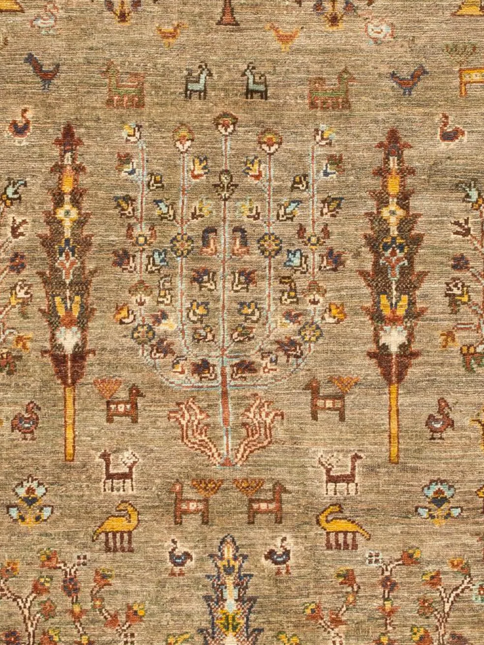 mit Landschaftsmotiven im Stil kaukasischer Teppiche. Das Wort „Gayoon“ kommt aus der Pakistanischen Sprache Urdu und bedeutet „“Landschaft““ oder auch „“Garten““. Durch den flachen und festen Flor ist der Teppich unempfindlich gegenüber den Belastungen des Alltags. – Der Teppich wurde ausGhazni