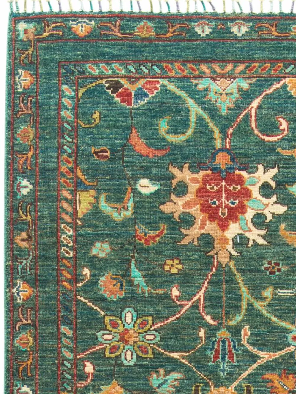 , einem klassischen Blütenmuster. Das Wort „Phool“ kommt aus der Pakistanischen Sprache Urdu und bedeutet „“Blume““. Durch den flachen und festen Flor ist der Teppich unempfindlich gegenüber den Belastungen des Alltags. – Der Teppich wurde ausGhazni