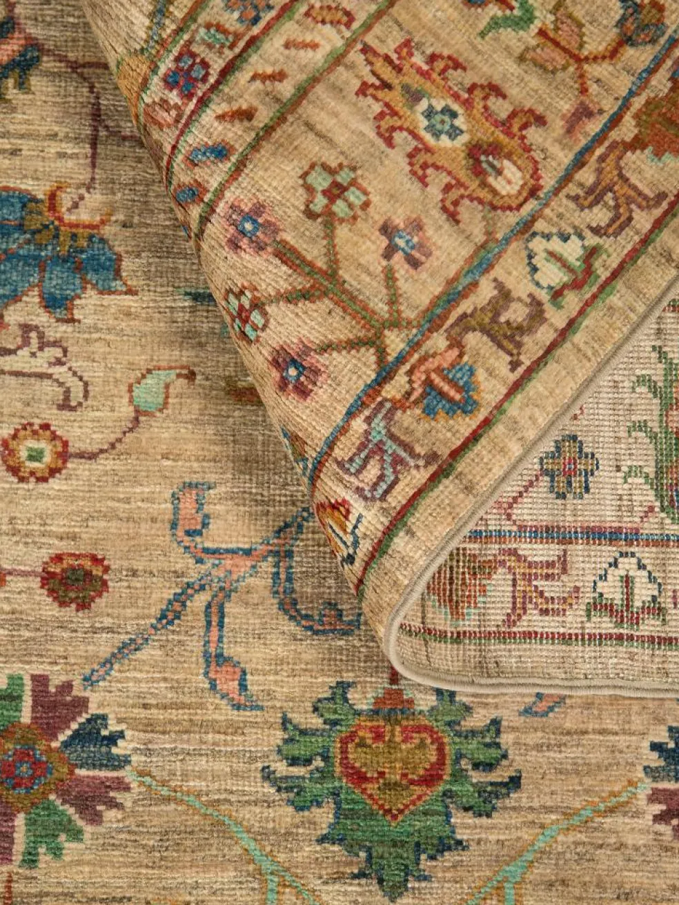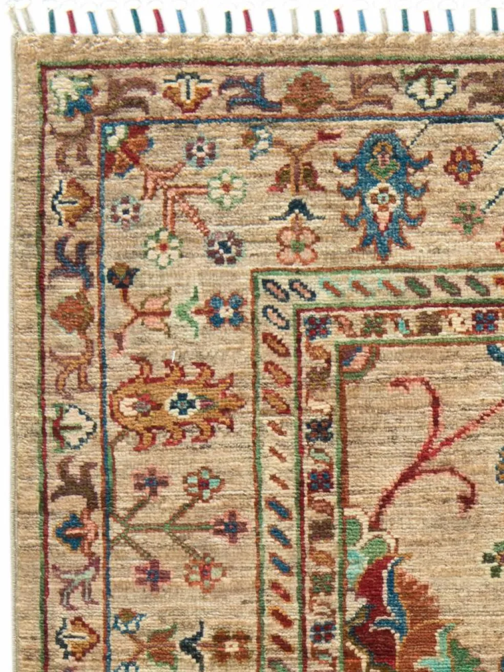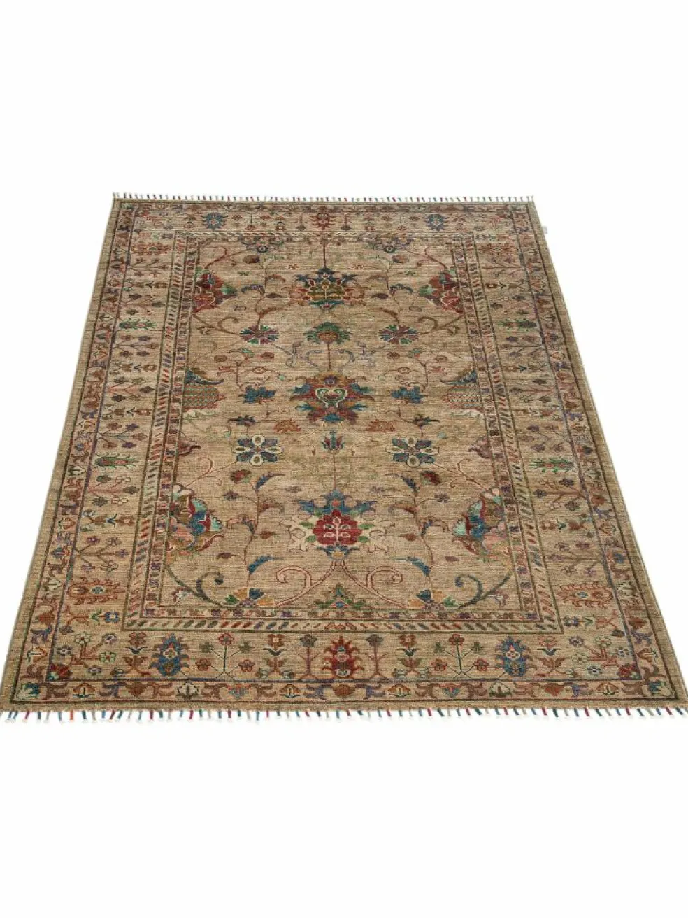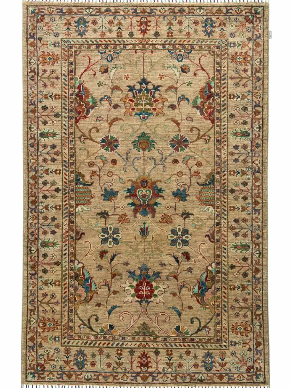 , einem klassischen Blütenmuster. Das Wort „Phool“ kommt aus der Pakistanischen Sprache Urdu und bedeutet „Blume“. Durch den flachen und festen Flor ist der Teppich unempfindlich gegenüber den Belastungen des Alltags. – Der Teppich wurde ausGhazni