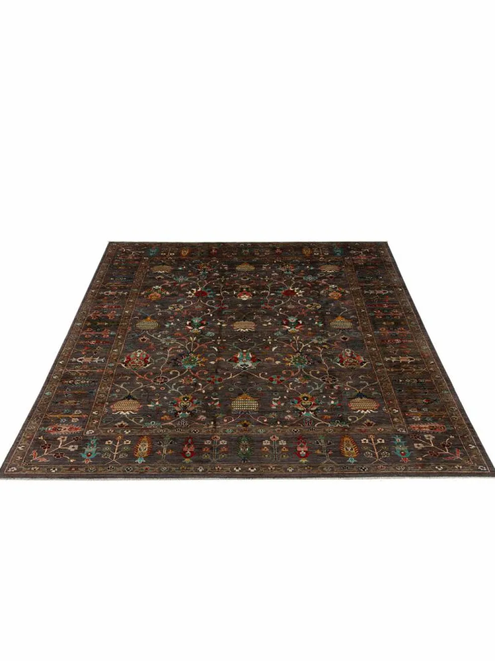 , einem klassischen Blütenmuster. Das Wort „Phool“ kommt aus der Pakistanischen Sprache Urdu und bedeutet „“Blume““. Durch den flachen und festen Flor ist der Teppich unempfindlich gegenüber den Belastungen des Alltags. – Der Teppich wurde ausGhazni