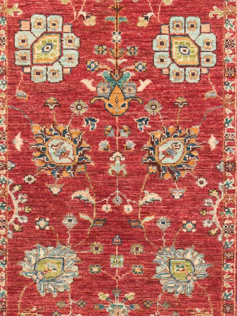 , einem klassischen Blütenmuster. Das Wort „Phool“ kommt aus der Pakistanischen Sprache Urdu und bedeutet „“Blume““. Durch den flachen und festen Flor ist der Teppich unempfindlich gegenüber den Belastungen des Alltags. – Der Teppich wurde ausGhazni