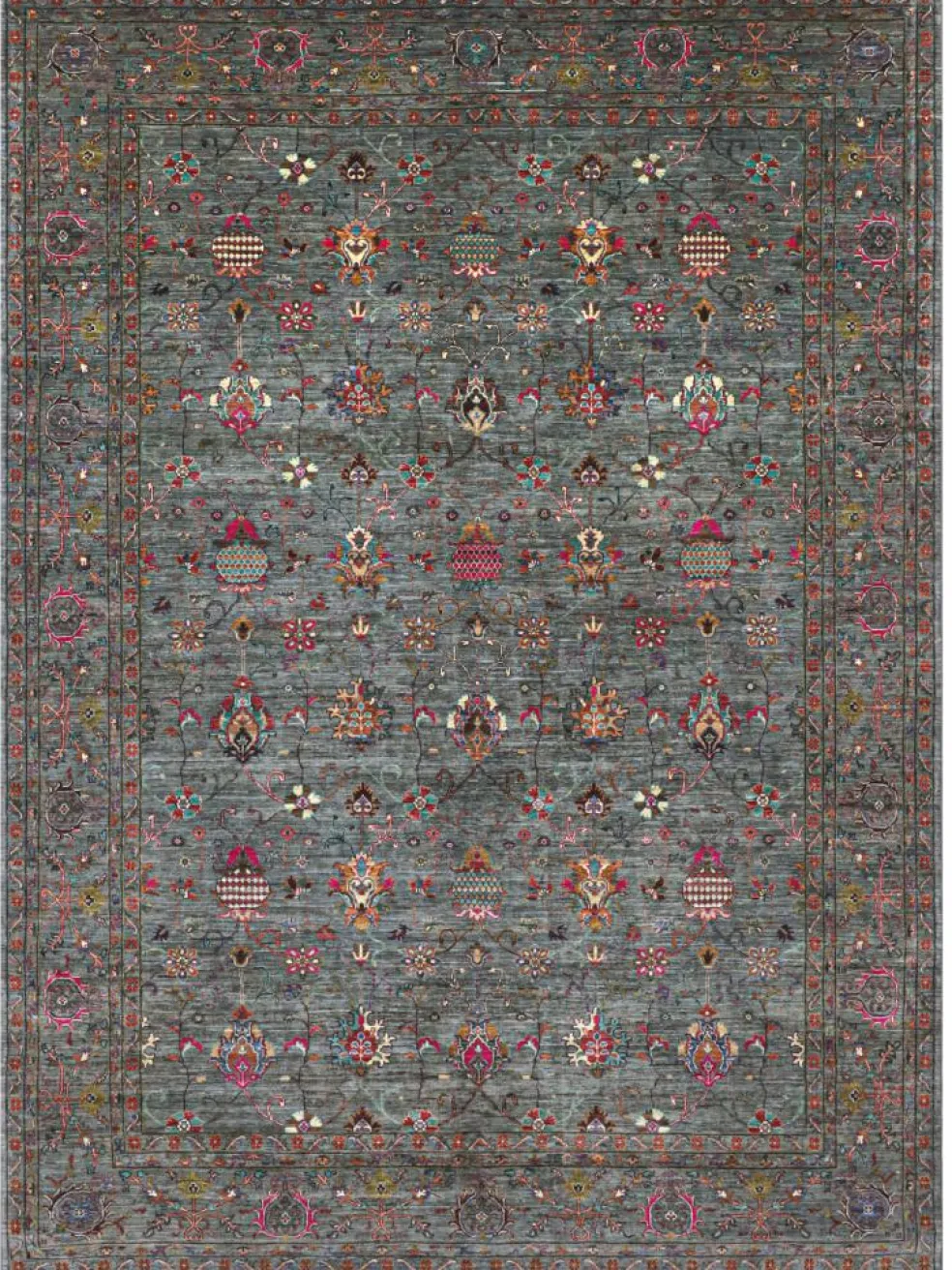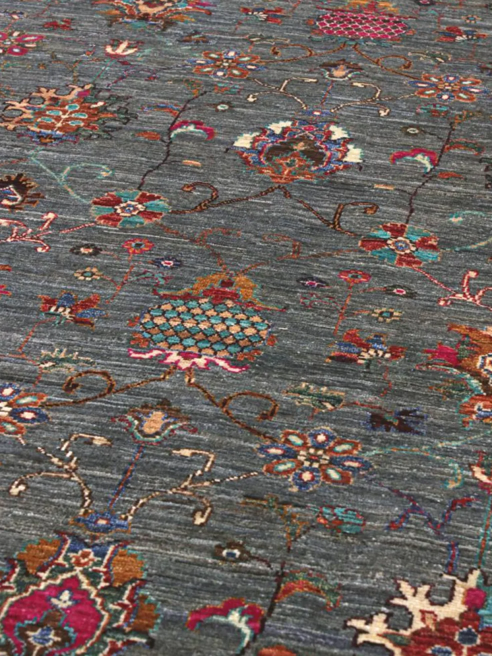 , einem klassischen Blütenmuster. Das Wort „Phool“ kommt aus der Pakistanischen Sprache Urdu und bedeutet „Blume“. Durch den flachen und festen Flor ist der Teppich unempfindlich gegenüber den Belastungen des Alltags. – Der Teppich wurde ausGhazni