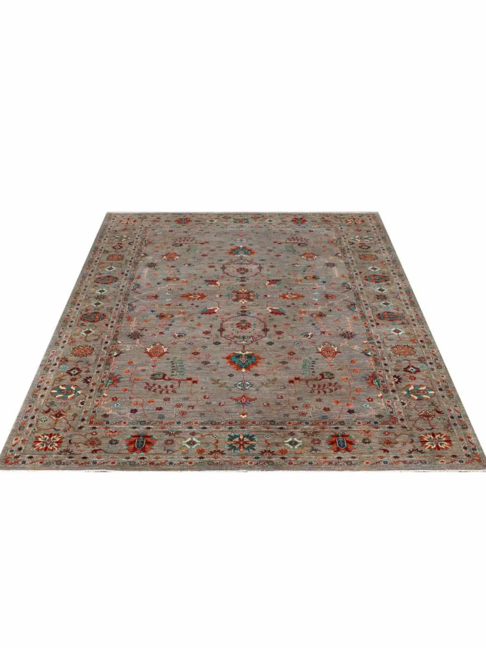 , einem klassischen Blütenmuster. Das Wort „Phool“ kommt aus der Pakistanischen Sprache Urdu und bedeutet „“Blume““. Durch den flachen und festen Flor ist der Teppich unempfindlich gegenüber den Belastungen des Alltags. – Der Teppich wurde ausGhazni