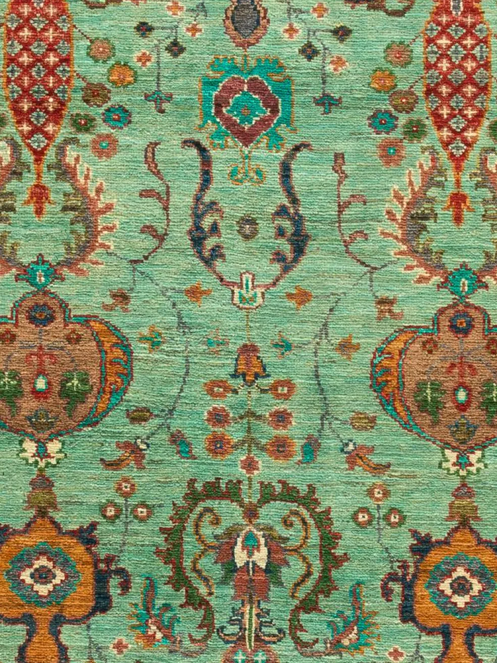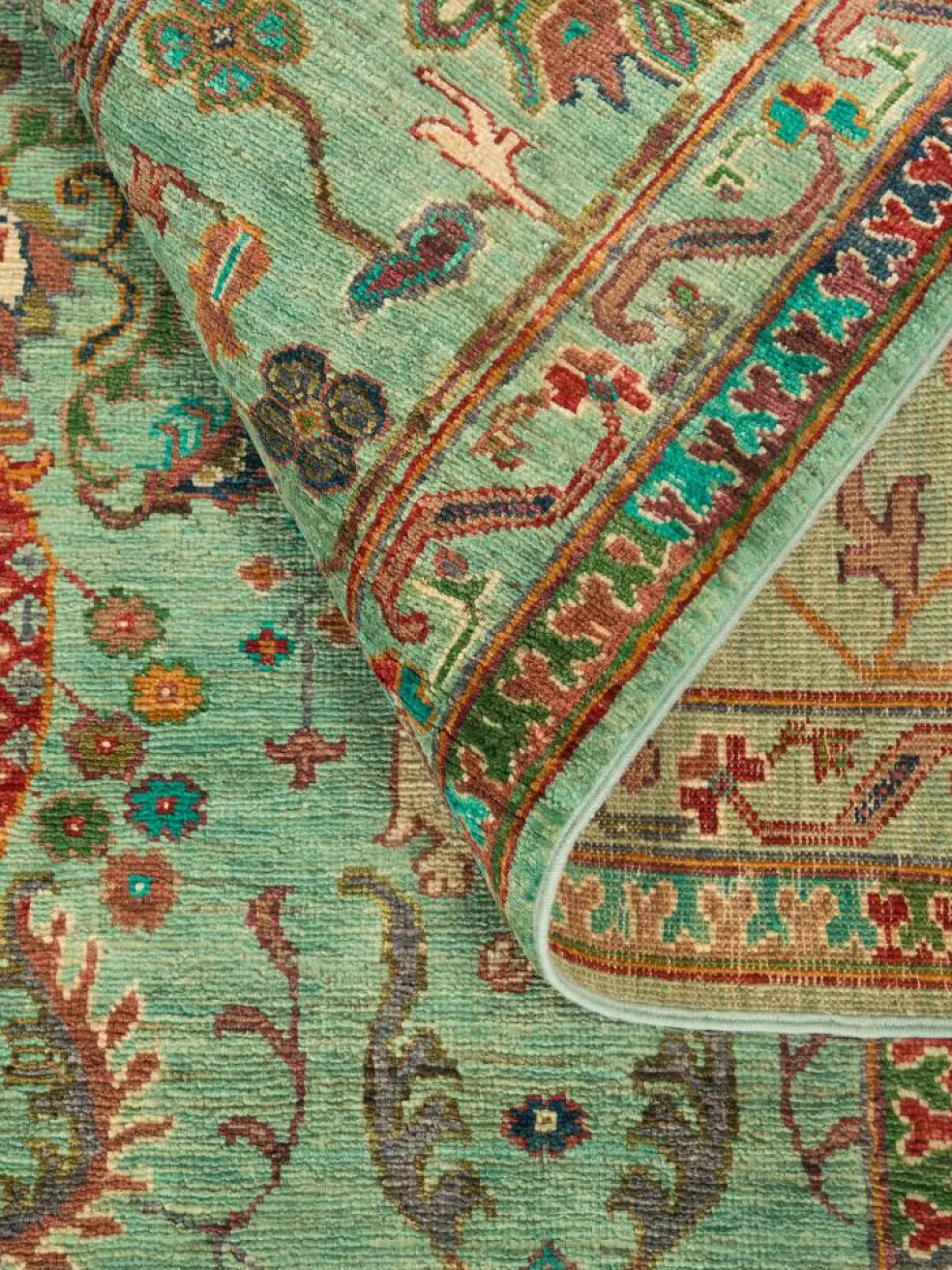 , einem klassischen Blütenmuster. Das Wort „Phool“ kommt aus der Pakistanischen Sprache Urdu und bedeutet „Blume“. Durch den flachen und festen Flor ist der Teppich unempfindlich gegenüber den Belastungen des Alltags. – Der Teppich wurde ausGhazni