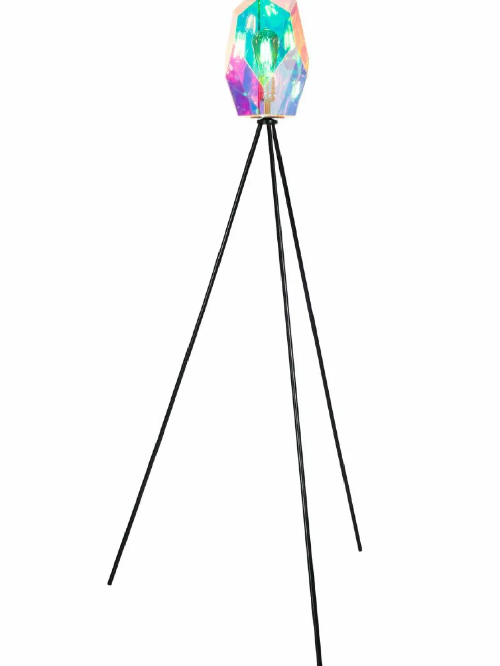 Die Stehlampe hat einen Lampenschirm in wunderschöner Kristallform, welcher das Licht wie ein Prisma streut. Durch das bunt schillernde, transparente Acryl verändert sich die Farbe aus jedem Blickwinkel. Schwarzes Textilkabel mit Kippschalter. Zu verwendende Leuchtmittel (nicht inklusive): E27, max. 4W LED.