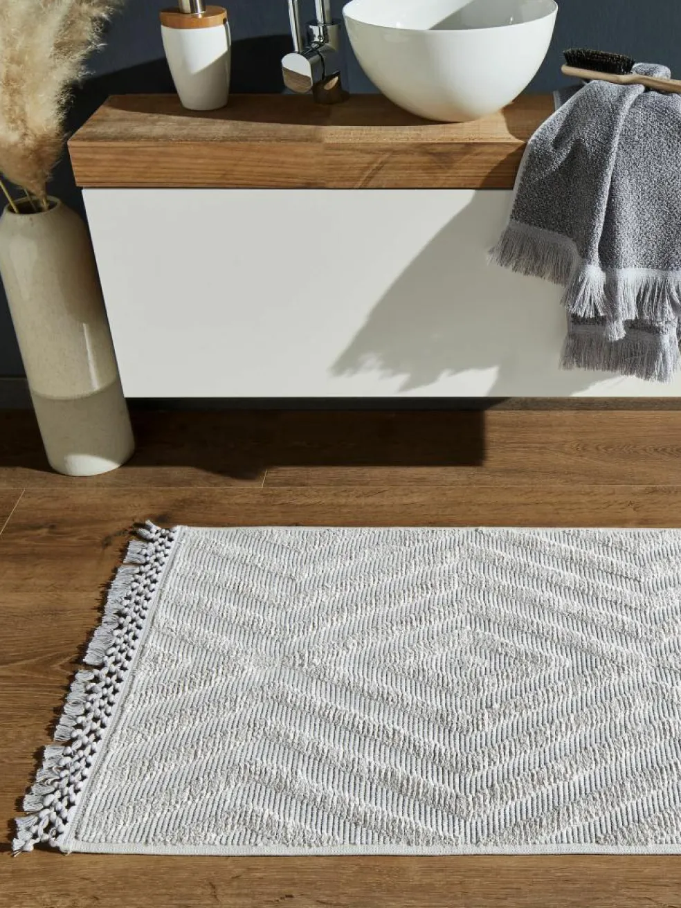 Samtweiche Badmatte aus reiner Baumwolle. Durch den Wechsel von Schlingen und Velours entsteht eine Oberfläche, die beim Begehen sanft die Füße massiert.