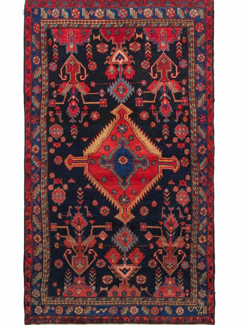 gehört zu den ältesten existierenden Städten Persiens. Der Flor ist relativ hoch und weich. Blüten, Blätter, Zweige und Vasen gruppieren sich in stark stilisierter Form um ein Mittelmedaillon.Die Gegend umHamadan