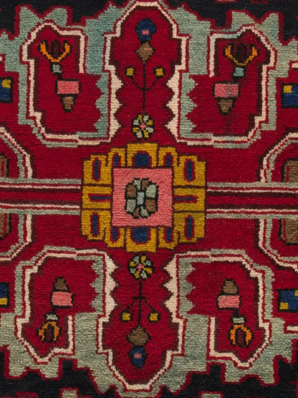 gehört zu den ältesten existierenden Städten Persiens. Der Flor ist relativ hoch und weich. Blüten, Blätter, Zweige und Vasen gruppieren sich in stark stilisierter Form um ein Mittelmedaillon.Die Gegend umHamadan