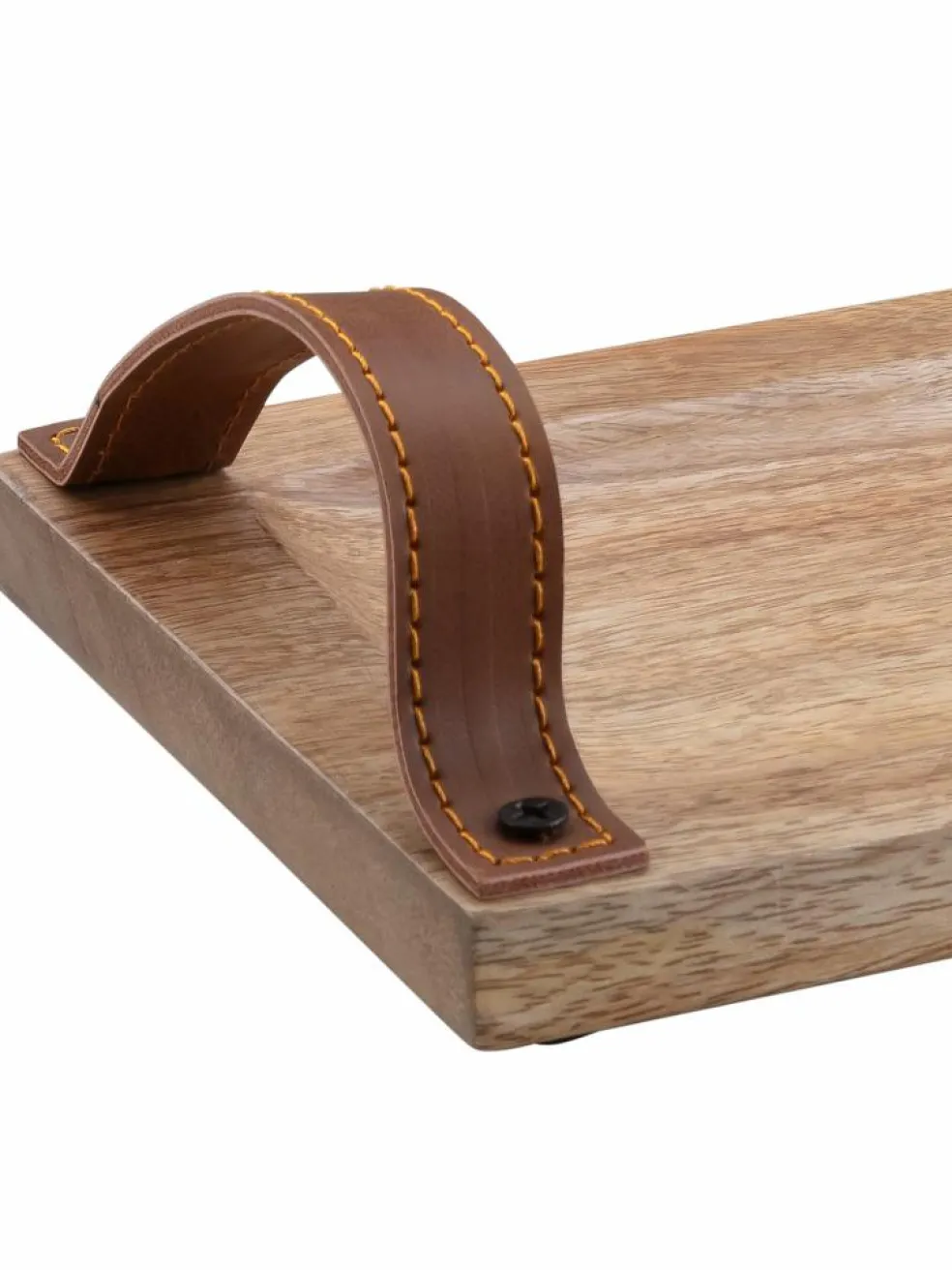 Wunderschönes Deko-Tablett aus hochwertigem Mangoholz. Die Griffe bestehen aus echtem Leder und machen den Transport einfach. Die helle Holzlasur rundet das natürliche Gesamtbild ab.