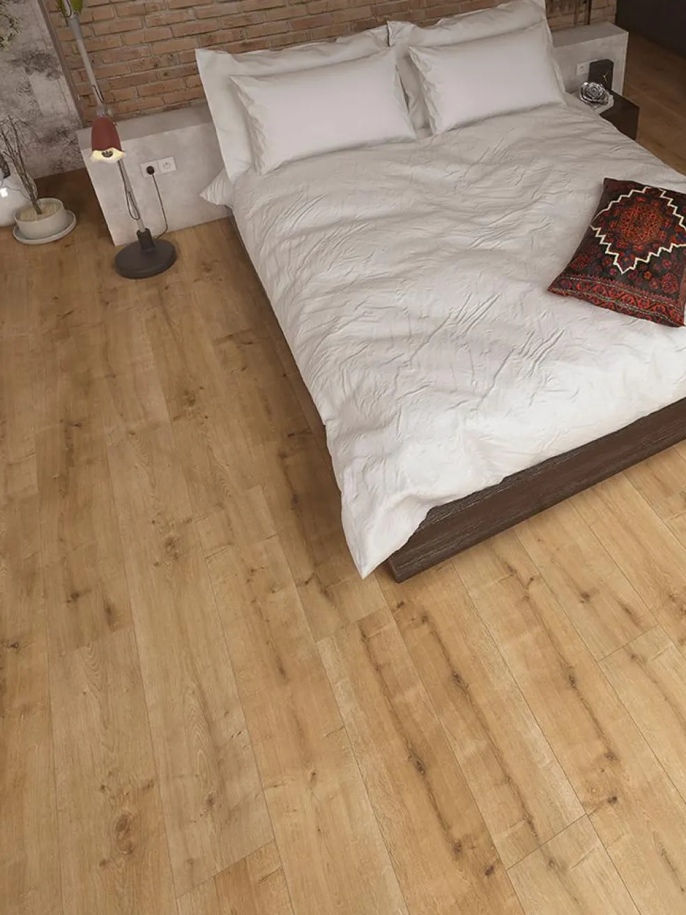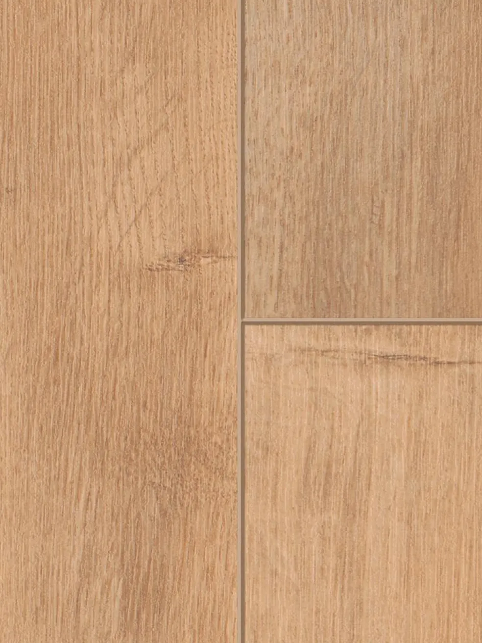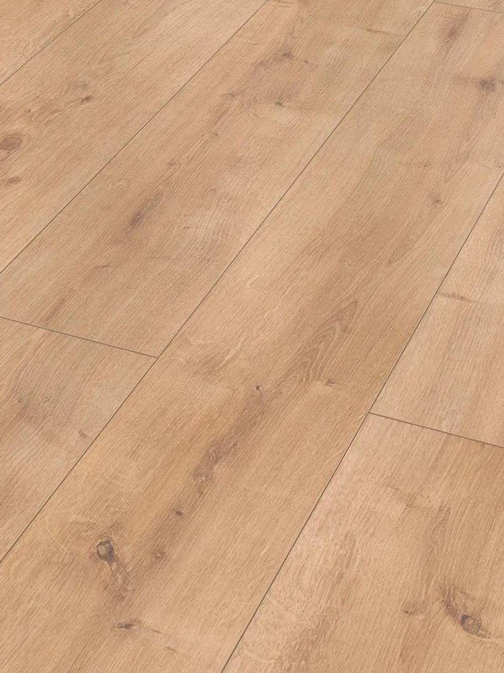 Dieser Laminat-Fußboden strahlt den authentischen Charme eines handwerklichen Holzbodens aus, denn seine Pluspunkte sind nicht nur die Wertigkeit der verwendeten Materialien, sondern auch die perfekte Verarbeitung. So sorgt seine feine V-Fuge an allen vier Seiten für ein detailgetreues Fugenbild und die fühlbare Oberflächenprägung entspricht der von echtem Holz. Zusätzlich ist der Boden wasserresistent.