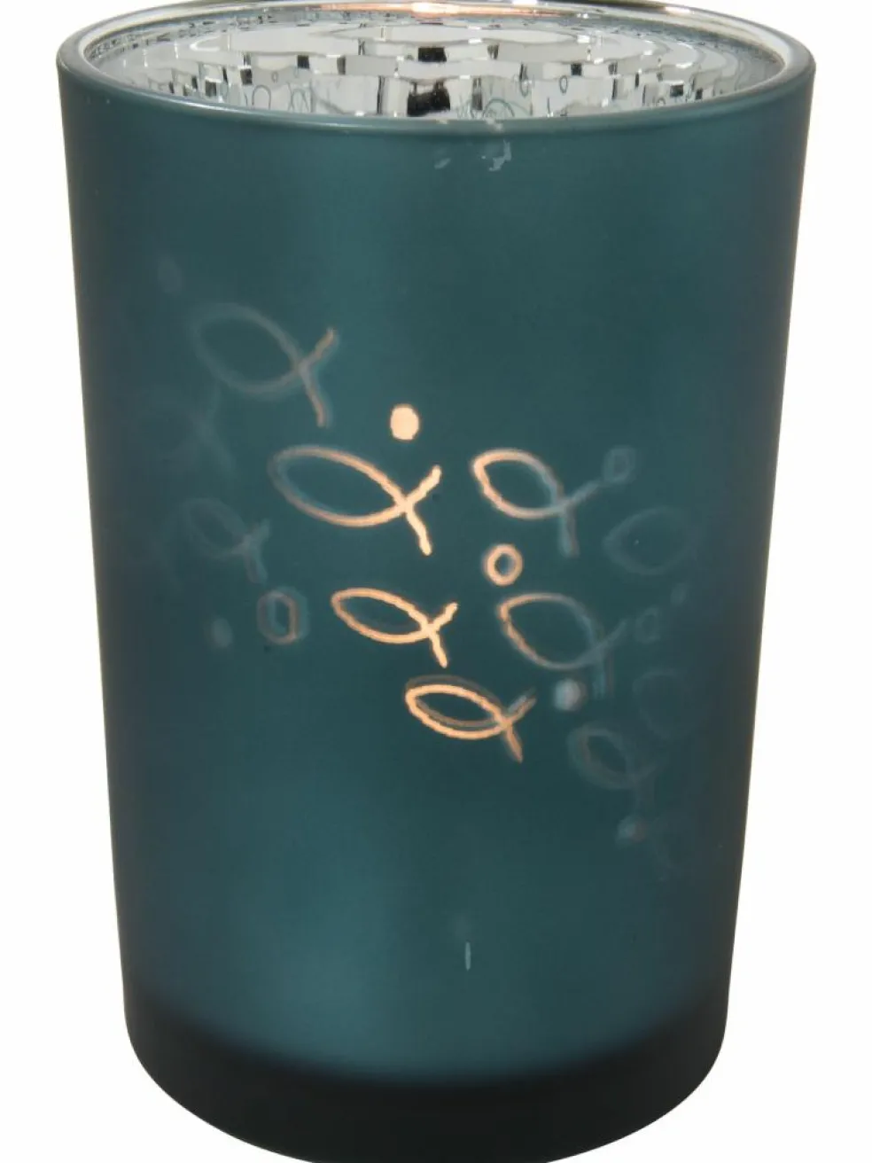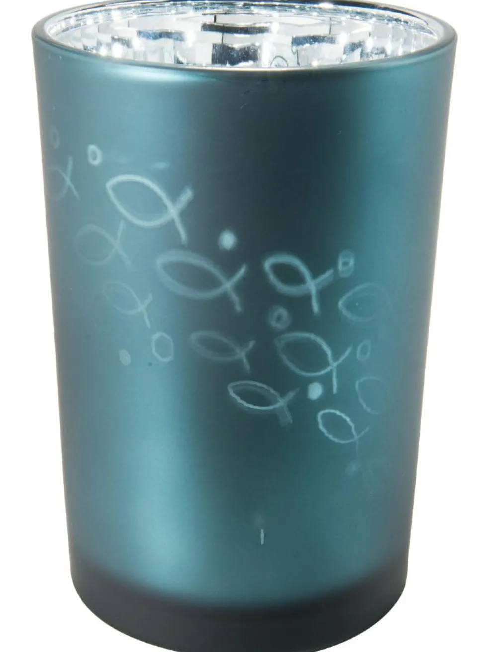 Teelichthalter aus Glas mit Laser Cut Motiv. Maritimes Fisch-Motiv. Glänzend-schimmernder Effekt durch silberne Verspiegelung im Glas.
