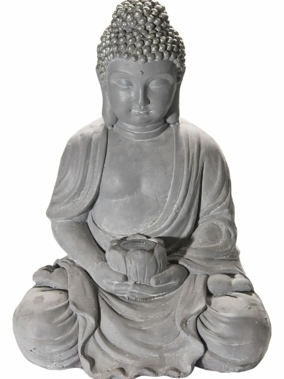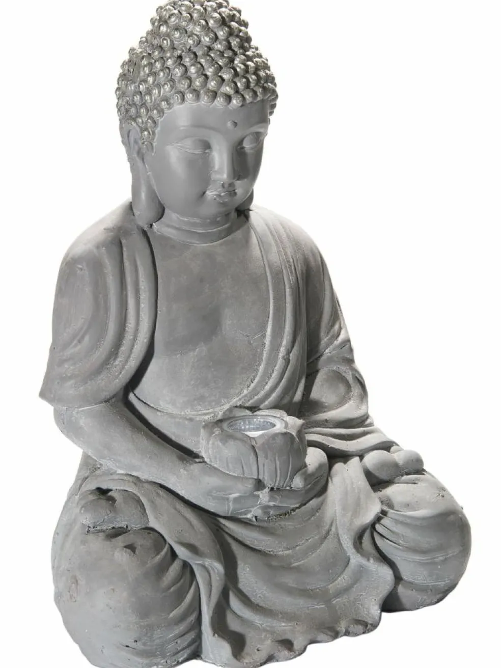 Buddha-Figur aus Magnesia perfekt für den Outdoorbereich. Inkl. LED Solarbeleuchtung.