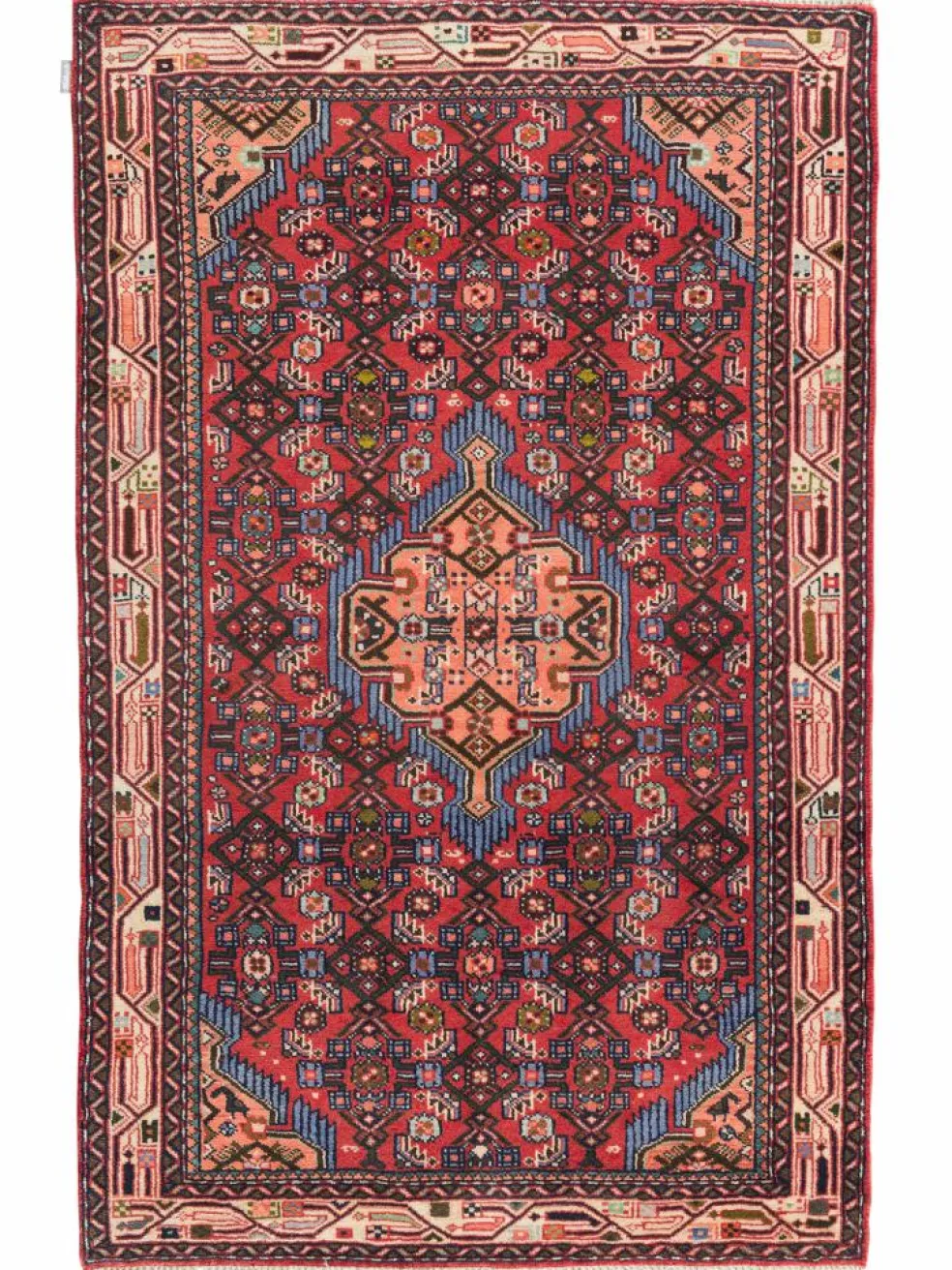 . Die Farben des Teppichs sind warm. Die Muster sind charakteristisch: Das Innenfeld ist mit einemMahi