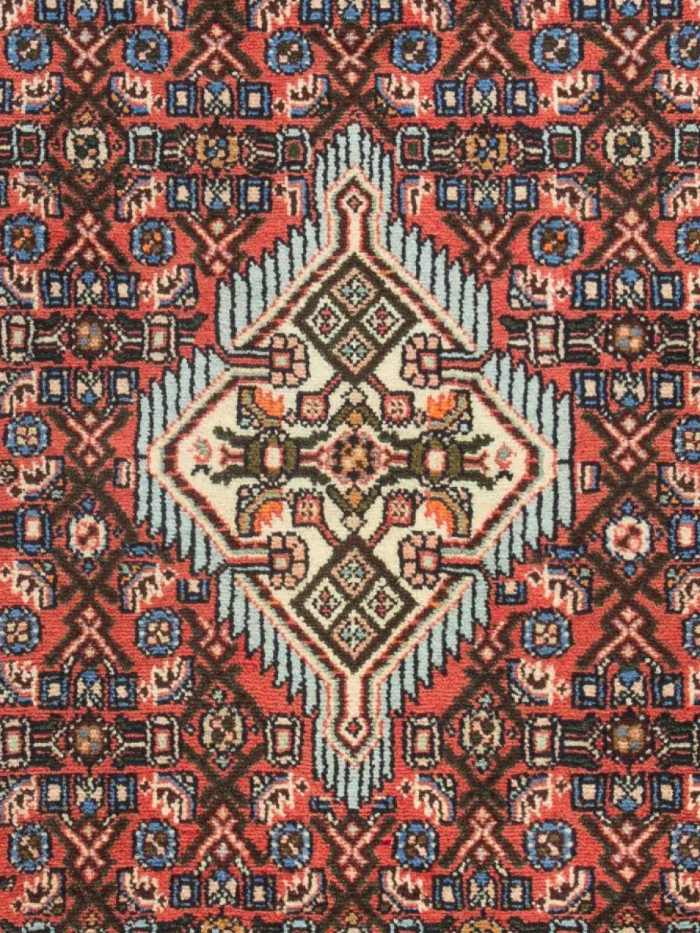 . Die Farben des Teppichs sind warm. Die Muster sind charakteristisch: Das Innenfeld ist mit einemMahi
