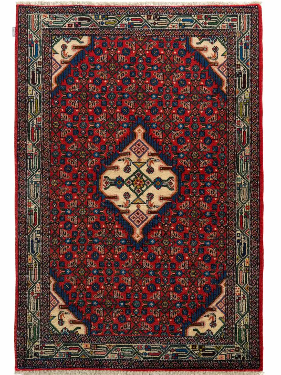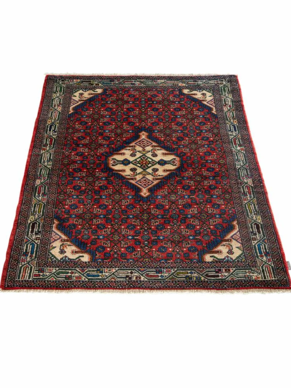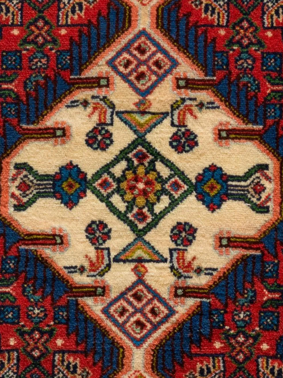 . Die Farben des Teppichs sind warm. Die Muster sind charakteristisch: Das Innenfeld ist mit einemMahi