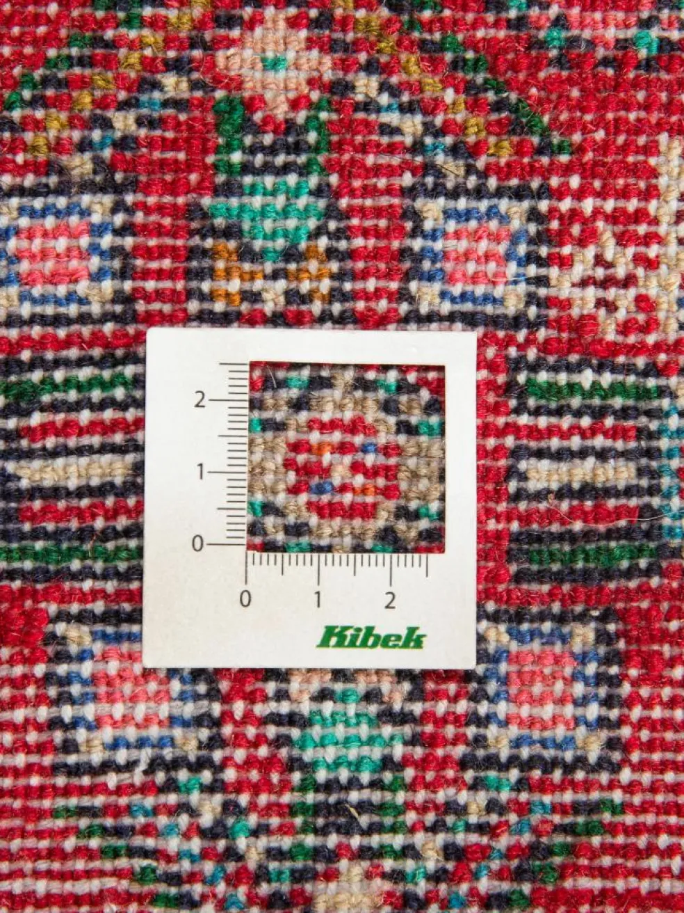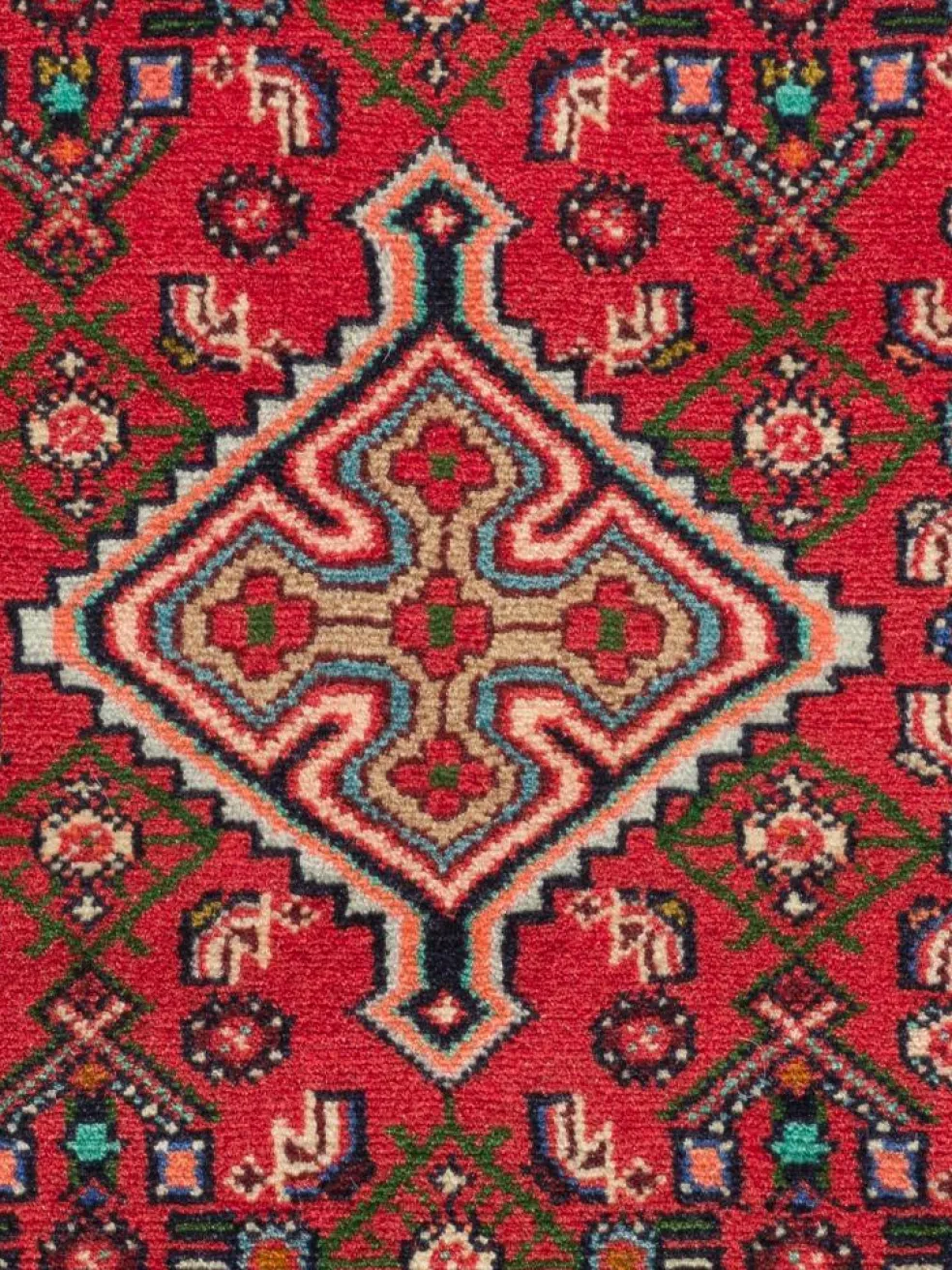 . Die Farben des Teppichs sind warm. Die Muster sind charakteristisch: Das Innenfeld ist mit einemMahi