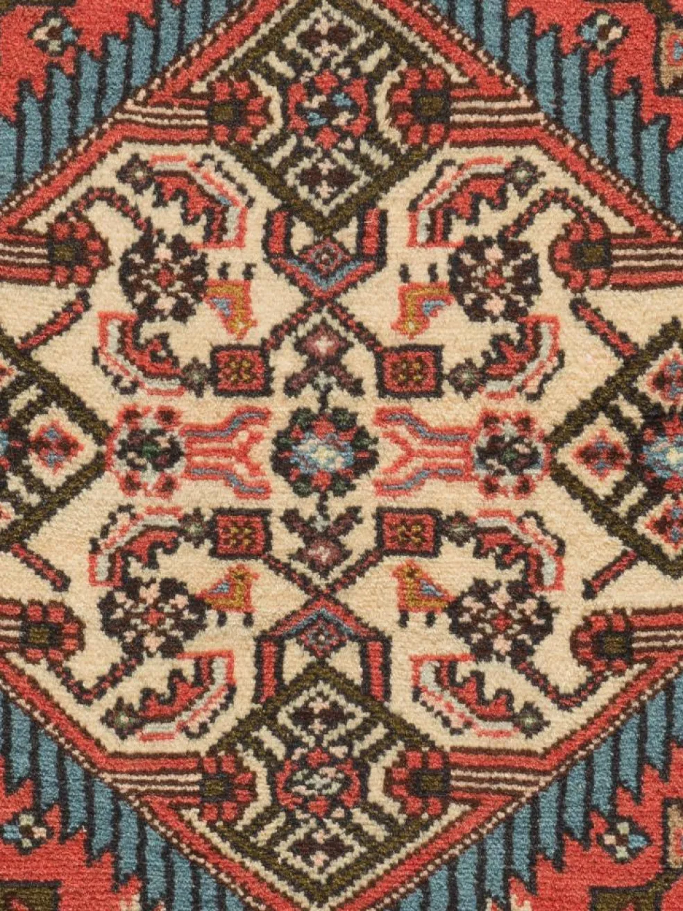 . Die Farben des Teppichs sind warm. Die Muster sind charakteristisch: Das Innenfeld ist mit einemMahi