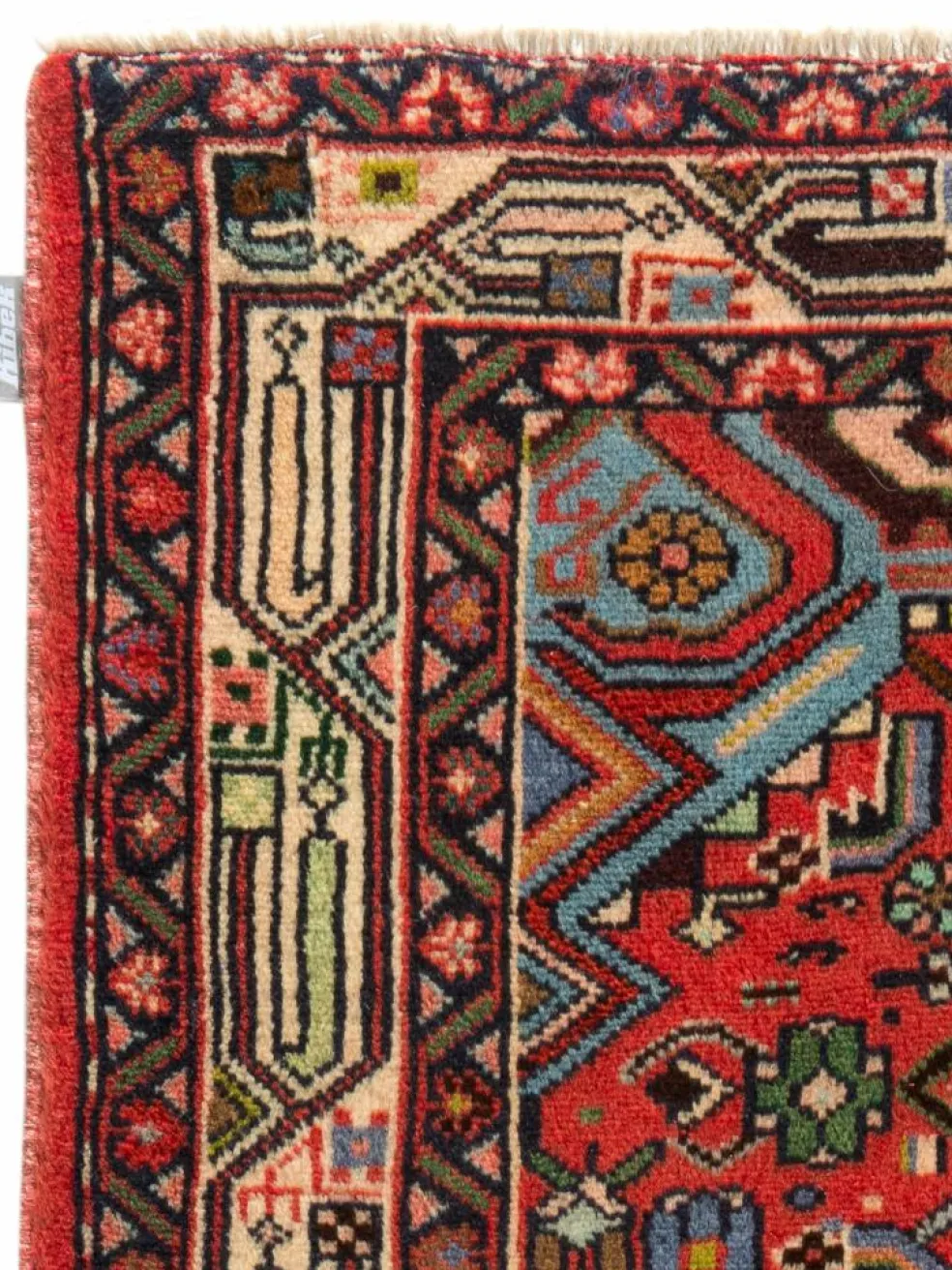 . Die Farben des Teppichs sind warm. Die Muster sind charakteristisch: Das Innenfeld ist mit einemMahi