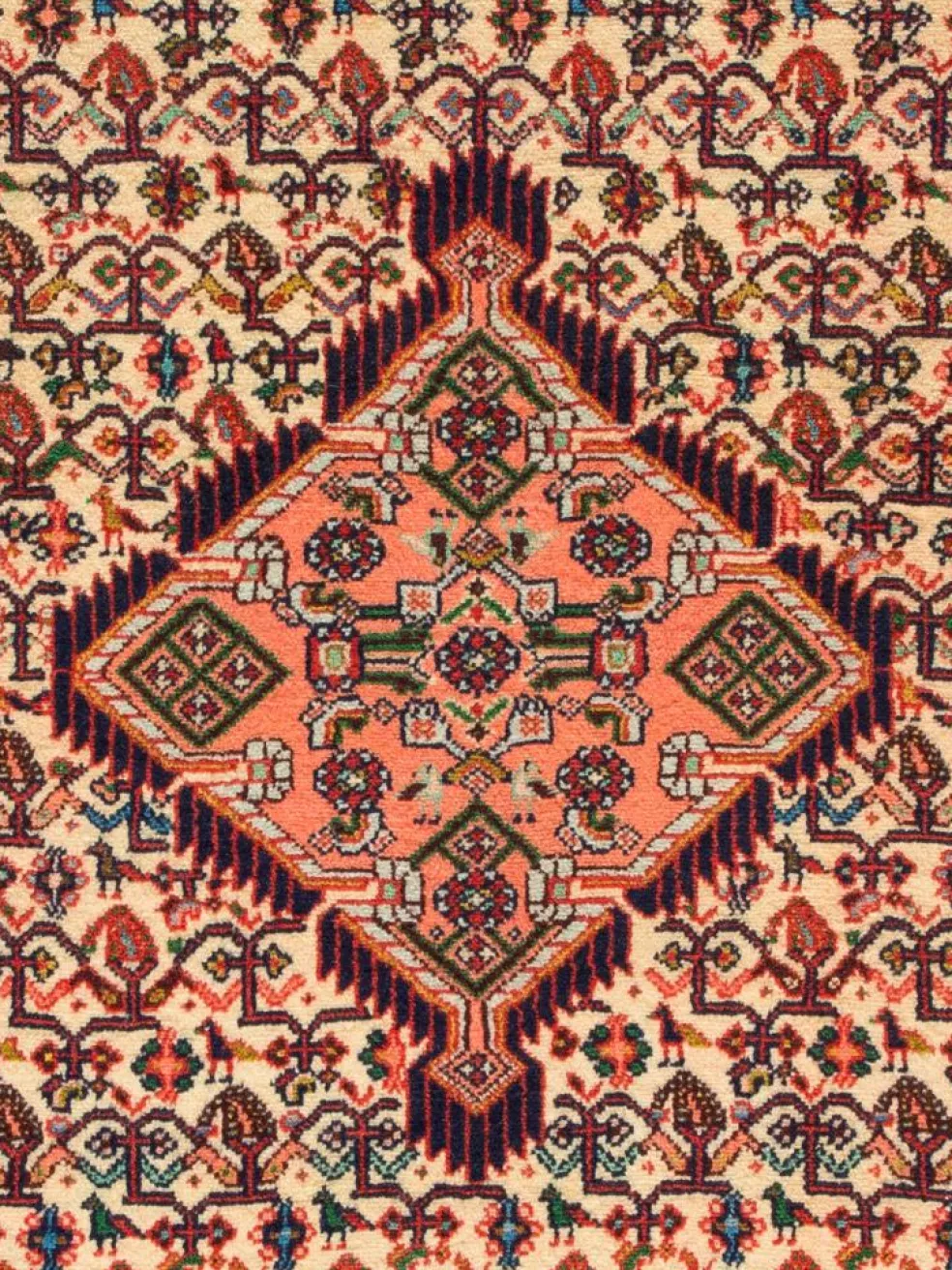 . Die Farben des Teppichs sind warm. Die Muster sind charakteristisch: Das Innenfeld ist mit einemMahi