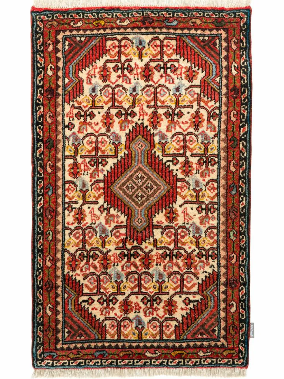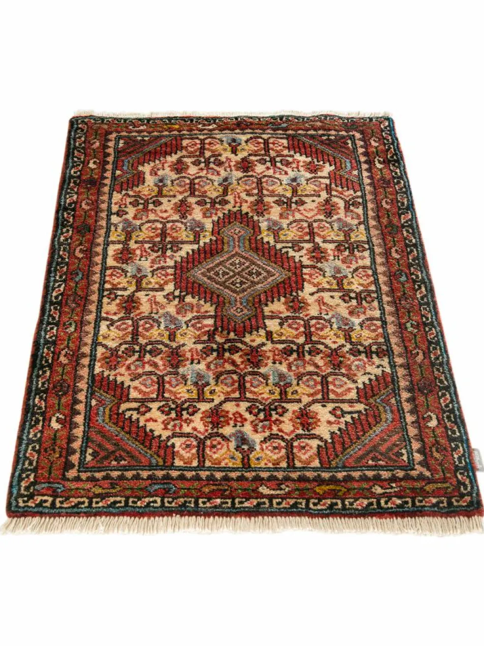 . Die Farben des Teppichs sind warm. Die Muster sind charakteristisch: Das Innenfeld ist mit einemMahi