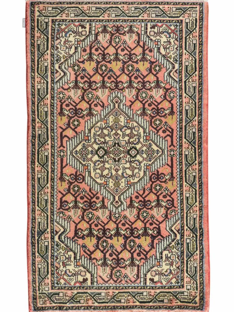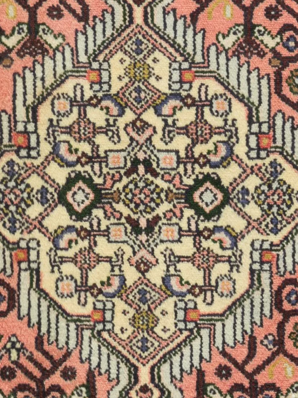 . Die Farben des Teppichs sind warm. Die Muster sind charakteristisch: Das Innenfeld ist mit einemMahi
