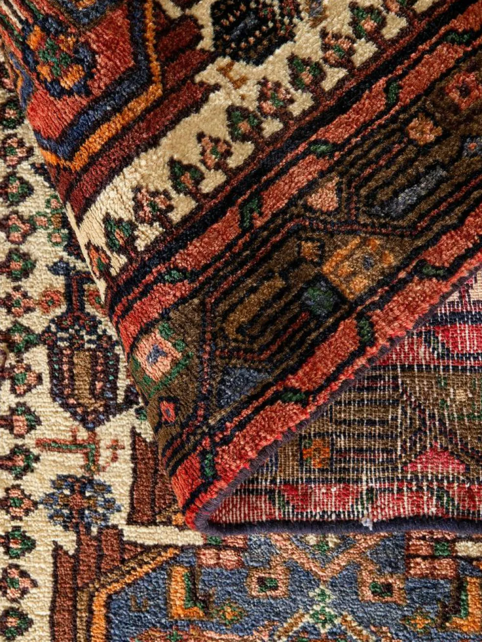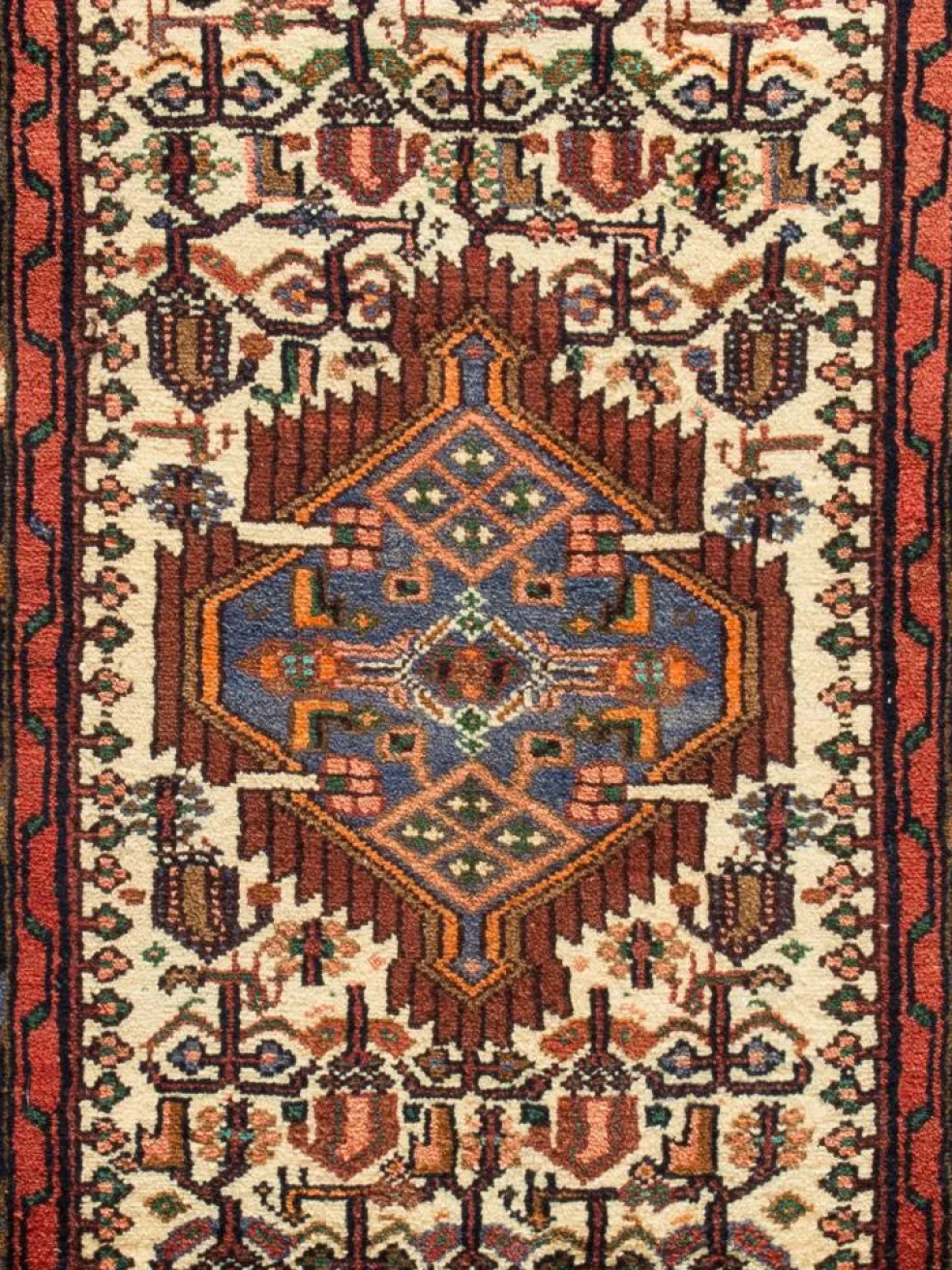 . Die Farben des Teppichs sind warm. Die Muster sind charakteristisch: Das Innenfeld ist mit einemMahi