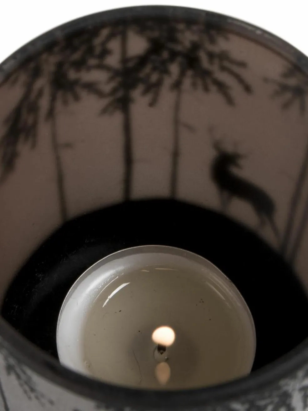 Unser Tocai Windlicht aus Glas wurde fein gelasert. Das Muster zeigt eine winterliche Landschaft. So entsteht ein spannendes Lichtspiel, das für gemütliche Stimmung sorgt.
