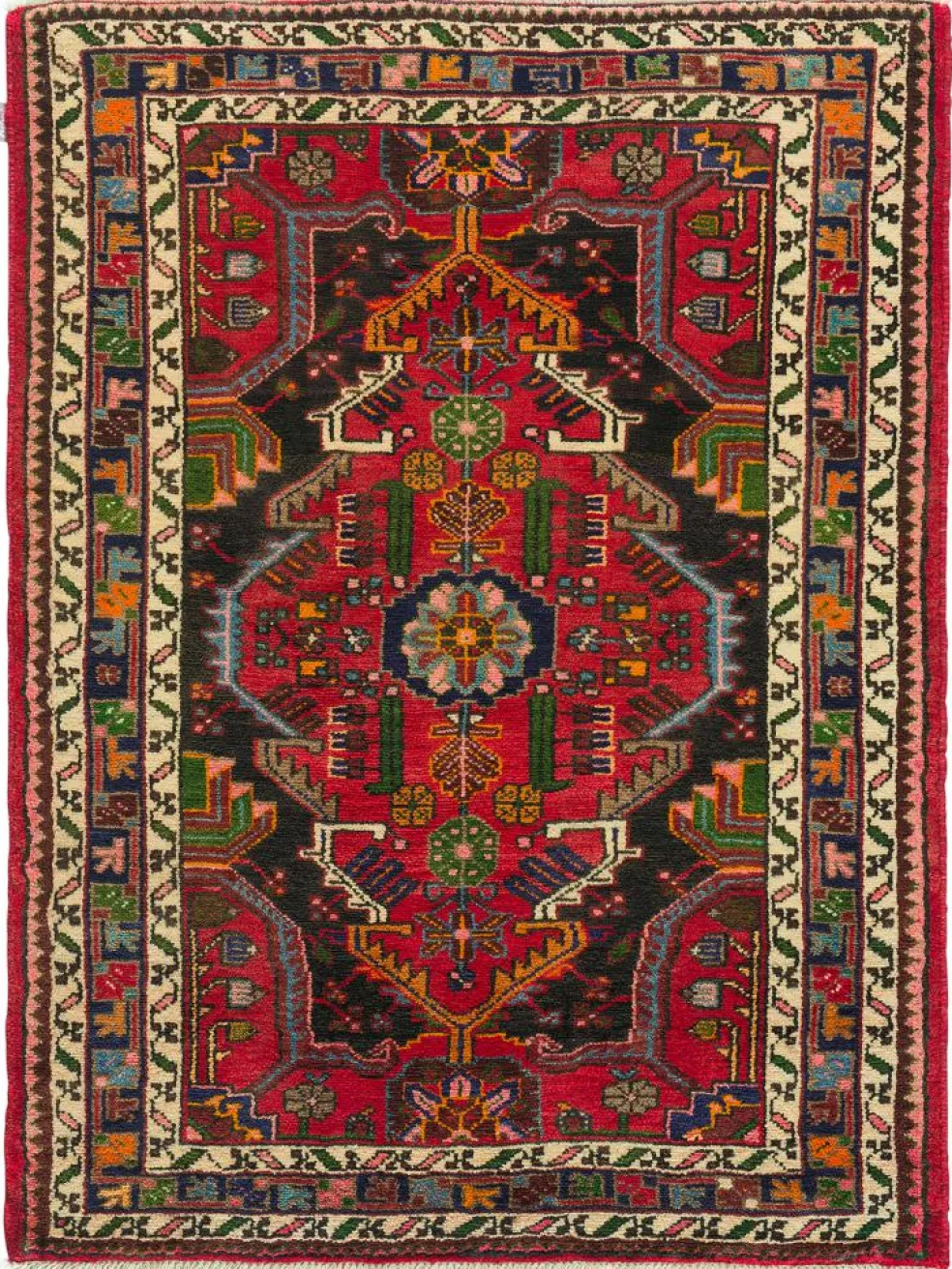 -Gebiets. Hier werden robuste Teppiche geknüpft. Charakteristisch ist ein beigefarbener oder schwarzer Grund, wenig gemustert, von dem sich das typische hexagonale Mittelmedaillon stark abhebt.- Die Gegend umHamadan