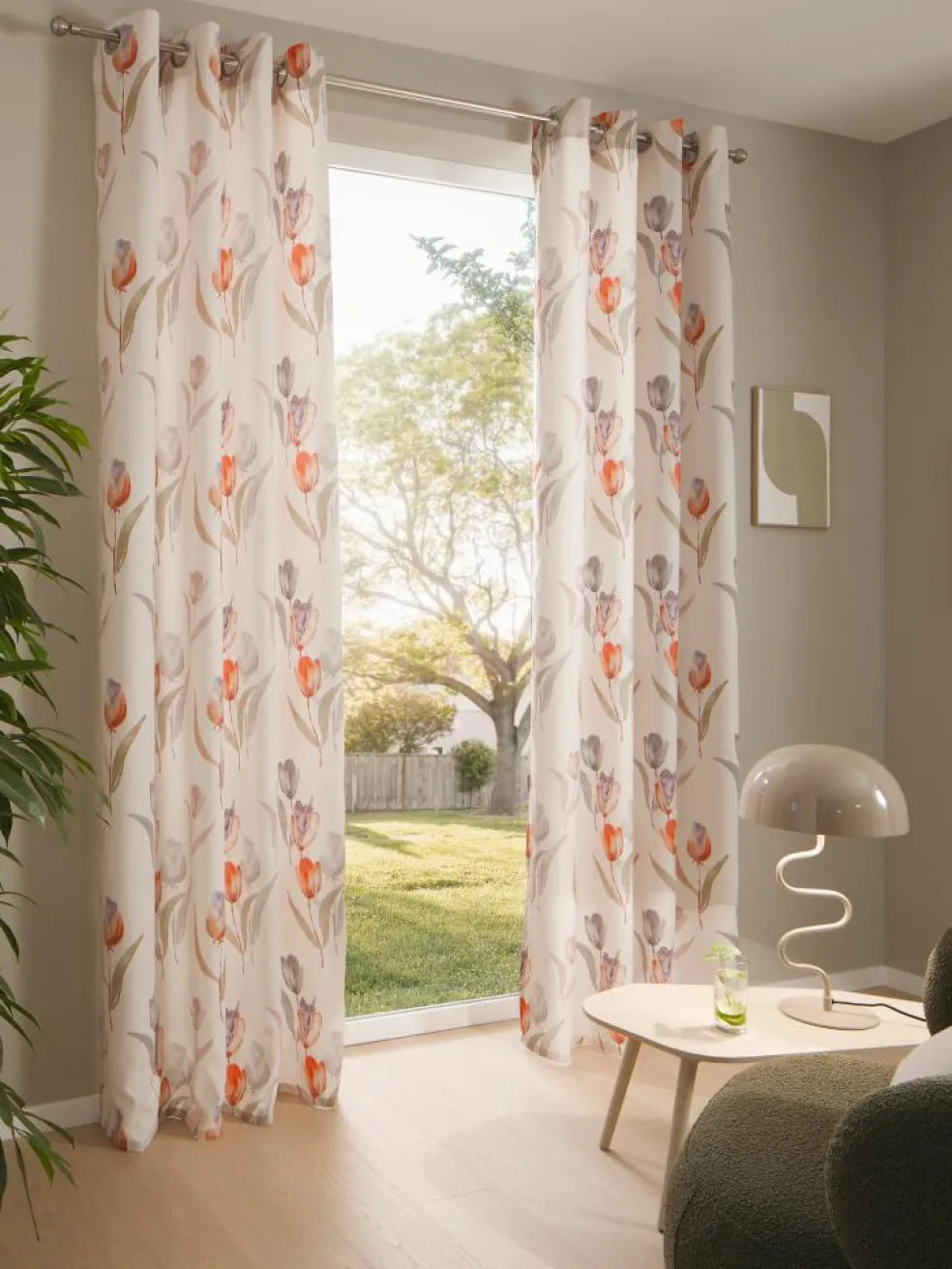 Tulissa ist der ideale Begleiter für den Frühling. Die frischen Farben erhalten durch das Tulpen-Design auf dem cremefarbenen Hintergrund extra Leuchtkraft und bringen den Raum zum Strahlen. Der Ösenschal (8 Ösen) wird aus 100 % Polyester hergestellt. Größe: ca. 140 x 245 cm. Paket enthält je einen Ösenschal.