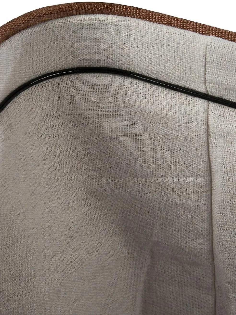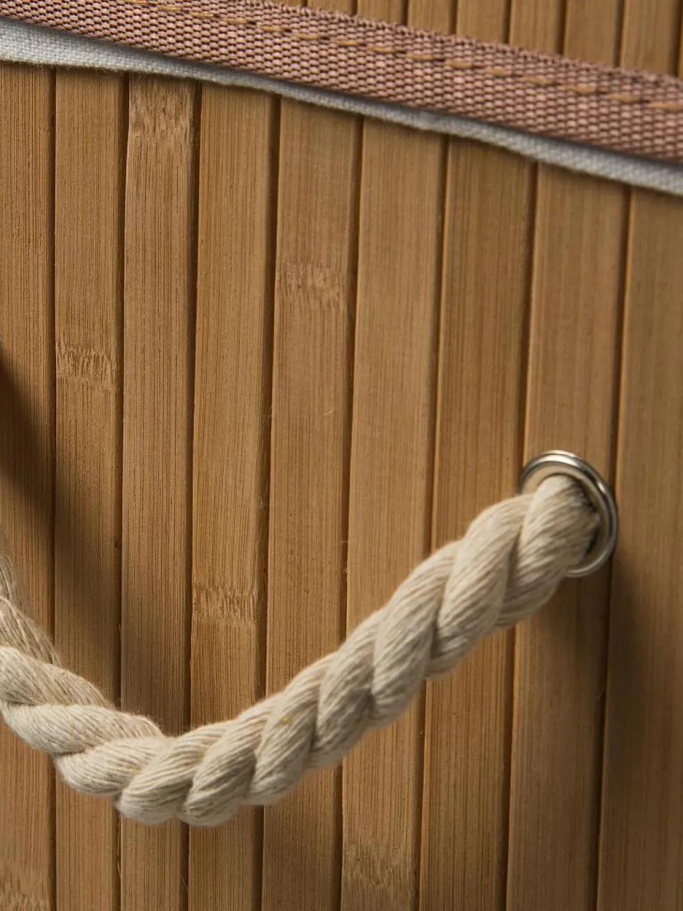 Wäschekorb aus Bambus. Innen mit Baumwollstoff ausgekleidet. Der Deckel ist mit einem Reißverschluß am Korpus befestigt und auch komplett abnehmbar. Mit Kordel-Griffen.