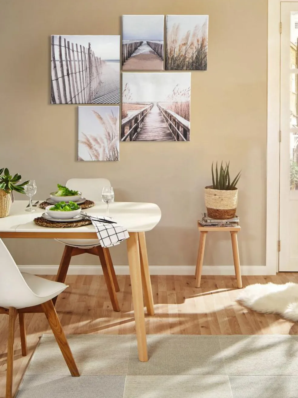 Lichtbeständiger Kunstdruck auf Holzrahmen montiert. Das Set besteht aus 5 Bildern in den Größen 2x 25 x 25 cm und 3x 15 x 20 cm.