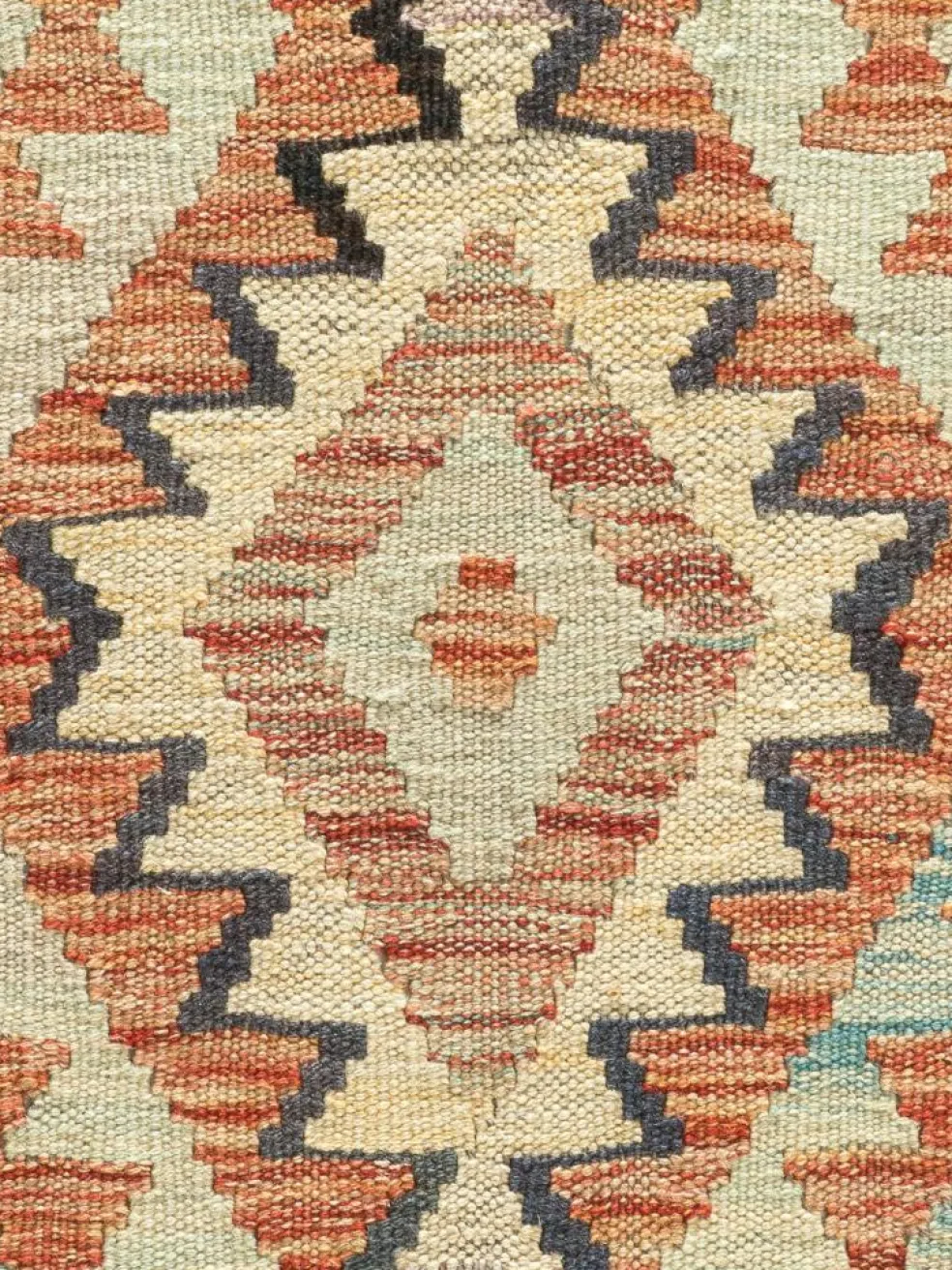 gehört zu den Schlitzkelims. Beim Schlitzkelim entsteht das Muster durch das farbige Schussmaterial, das bei einem Farbwechsel wieder zurück geführt wird. Dadurch entsteht ein sichtbarer Schlitz. Die Fadenenden werden eingearbeitet und sind nicht zu sehen. Durch diese Webart ist der AfghanKelim