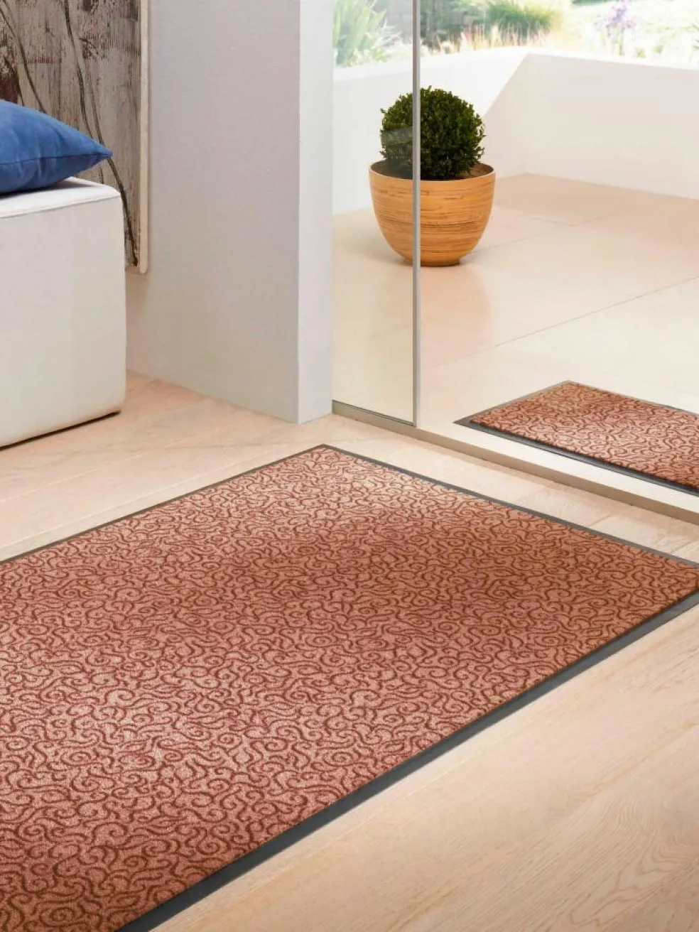 Sauberlauf-Matte mit modernem Dekor. Hält Flur und Wohnung sauber und trocken und ist extrem saugfähig. Die Rückseite ist zudem für mehr Sicherheit rutschhemmend ausgerüstet. Optisch wie funktional hochwertig. Extrem robust und widerstandsfähig. Flor 100 % Polyamid