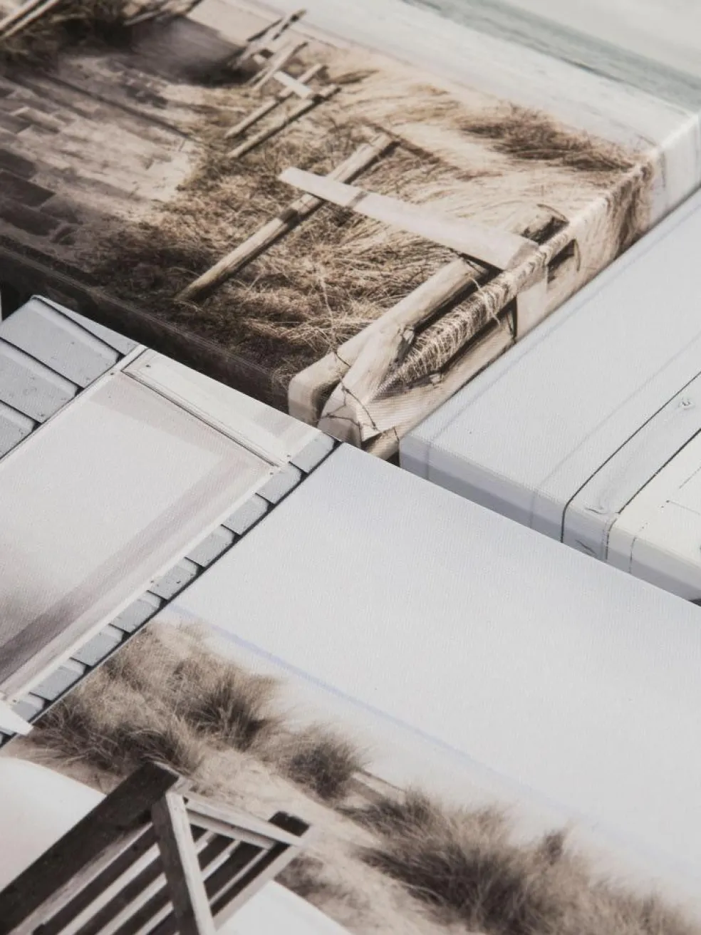 Stimmungsvolle Strandmotive. Lichtbeständiger Kunstdruck auf Holzrahmen montiert. Das Set besteht aus 5 Bildern in den Größen 2x 25 x 25 cm und 3x 15 x 20 cm.